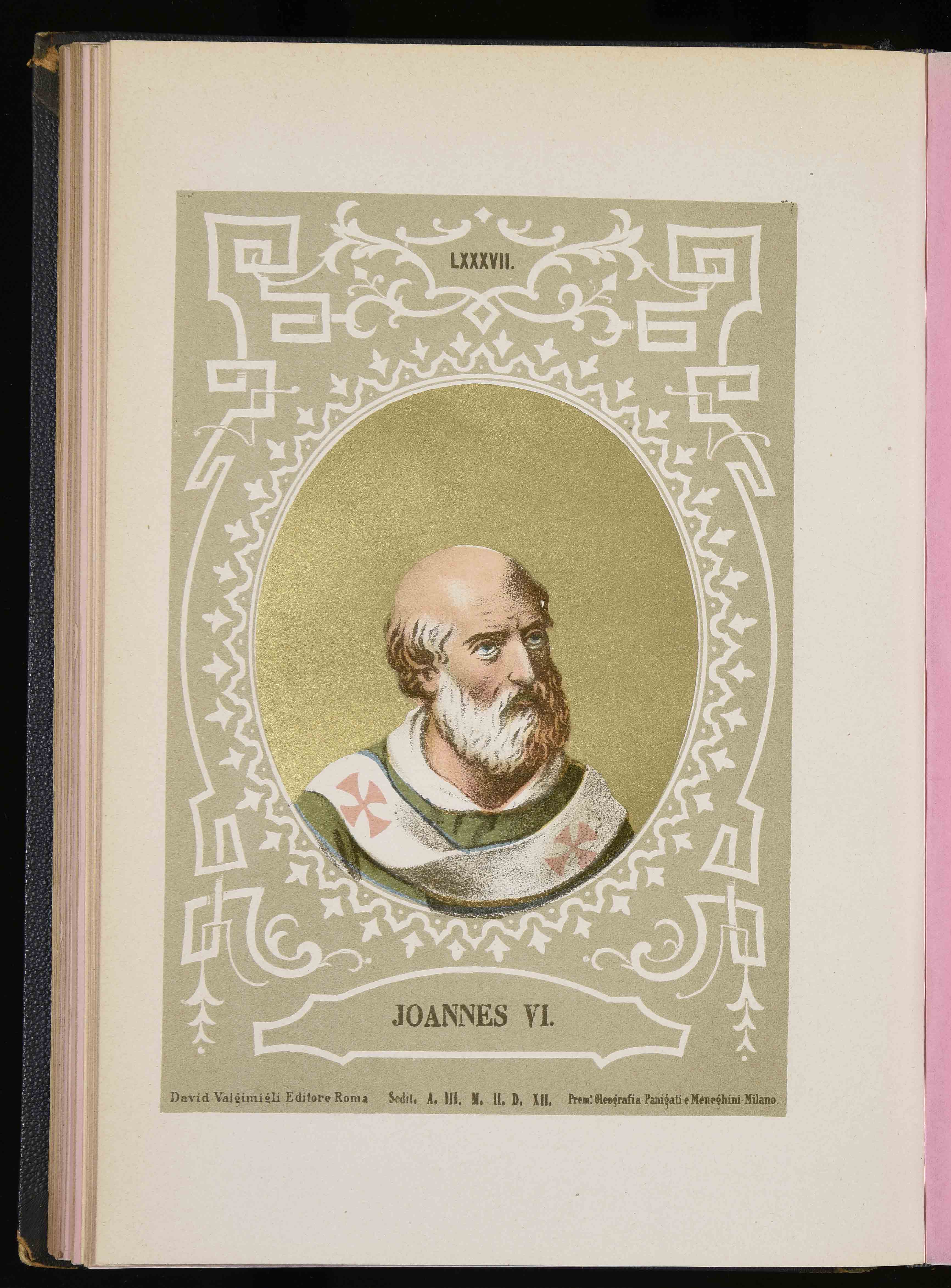 260x177 mm; in Luigi Tripepi, Ritratti e biografie dei romani pontefici: da S. Pietro a Leone XIII, Roma, Tipografia della Pace, 1879
