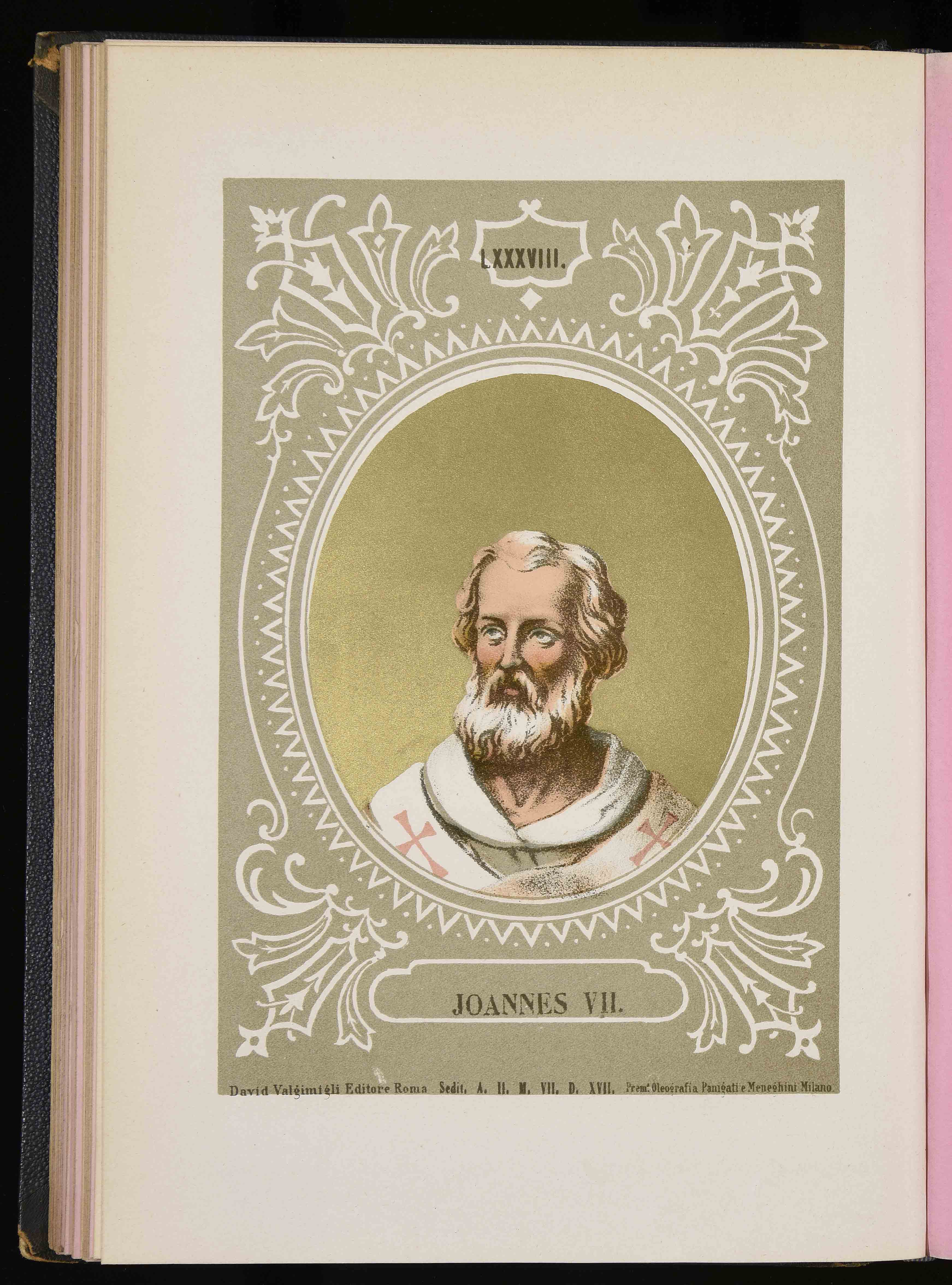 260x177 mm; in Luigi Tripepi, Ritratti e biografie dei romani pontefici: da S. Pietro a Leone XIII, Roma, Tipografia della Pace, 1879