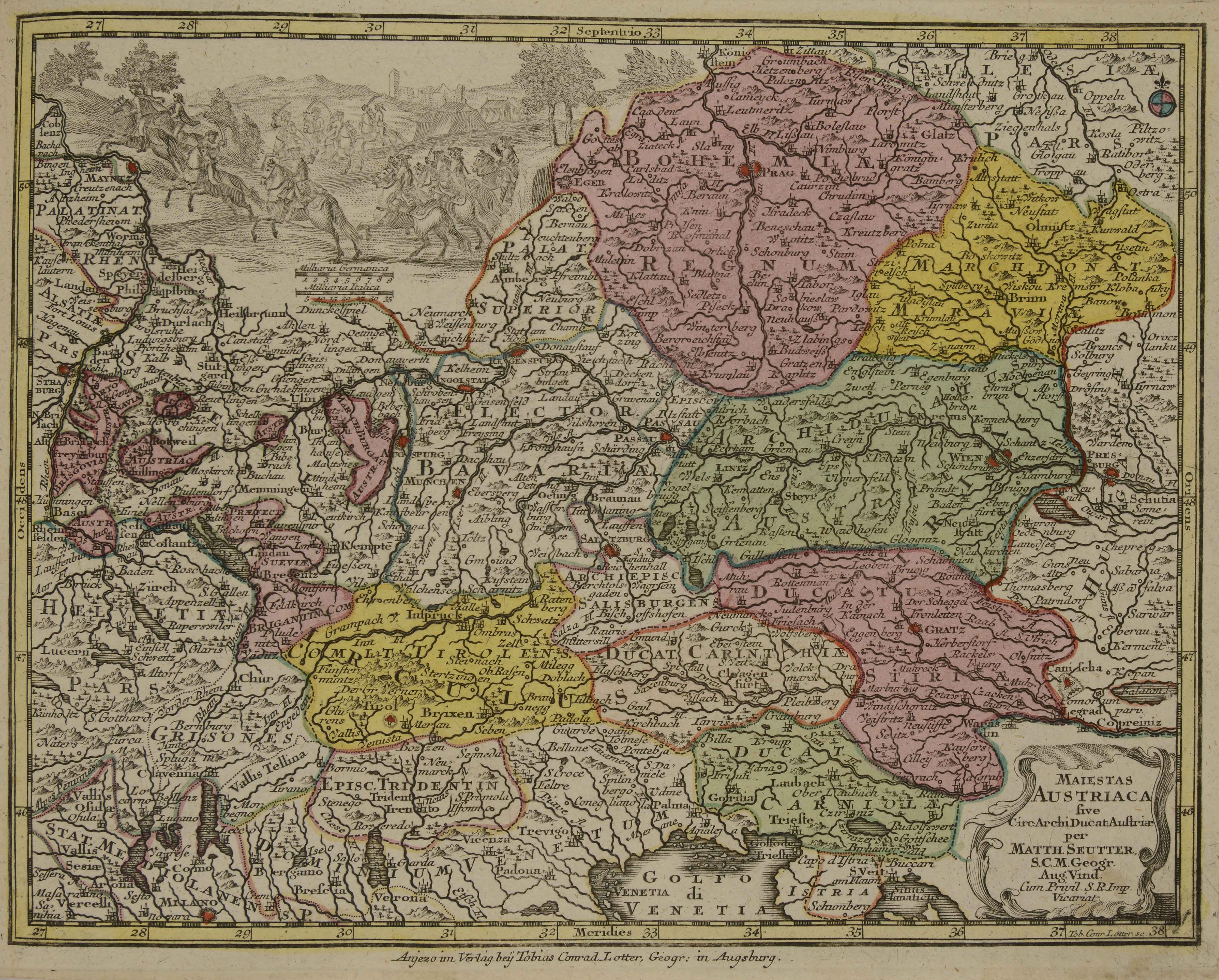 Calcografia; 210x265 mm. Pubblicata in Tobias Konrad Lotter, Atlas minor præcipua orbis terrarum imperia regna et provincias Germaniæ … Augsburg, Tobias Konrad Lotter, [1744?]