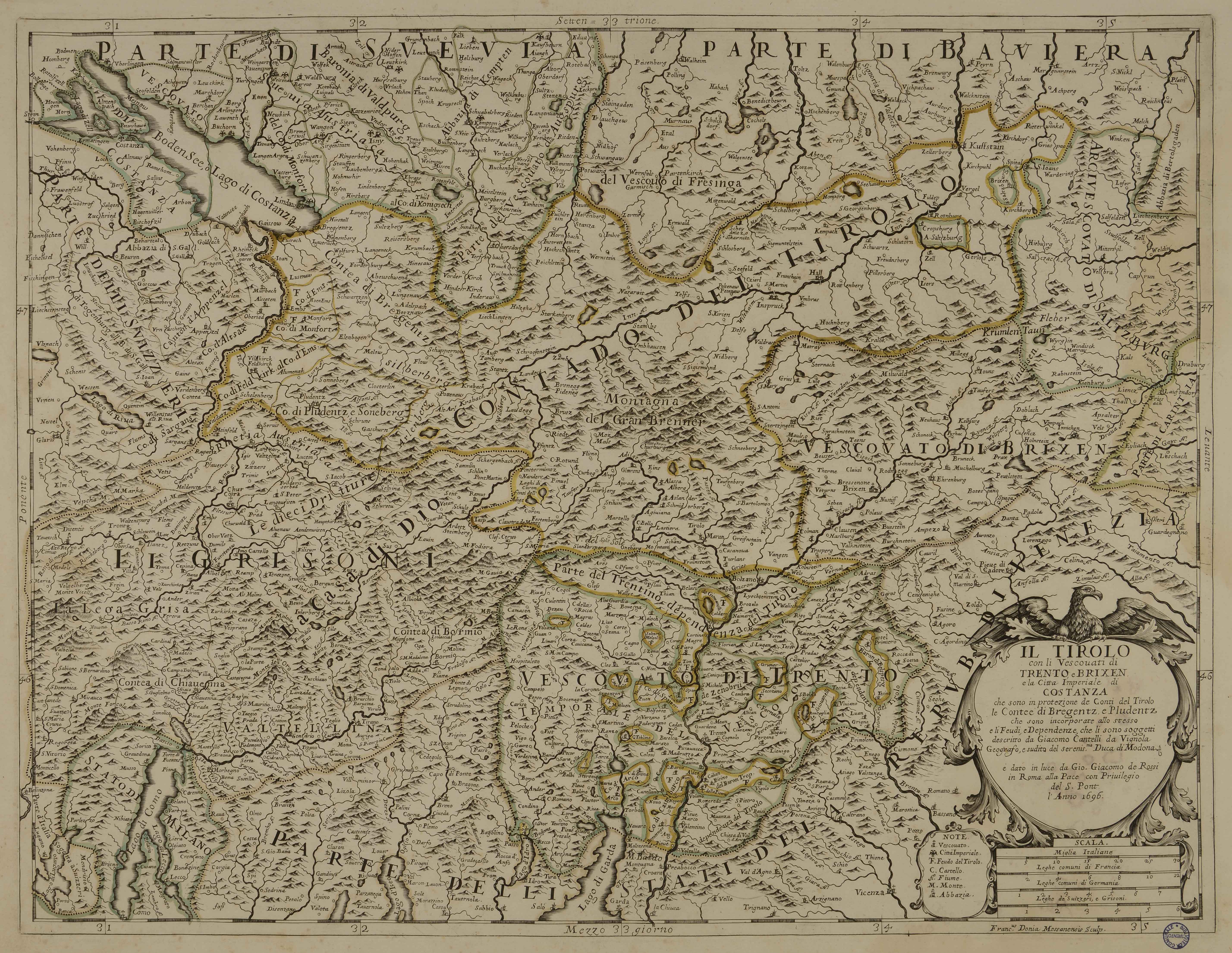 | Il Tirolo con li vescovati di Trento e Brixen e la citta imperiale di Costanza che sono in protezione de conti del Tirolo le contee di Bregentz e Pludentz ... |
