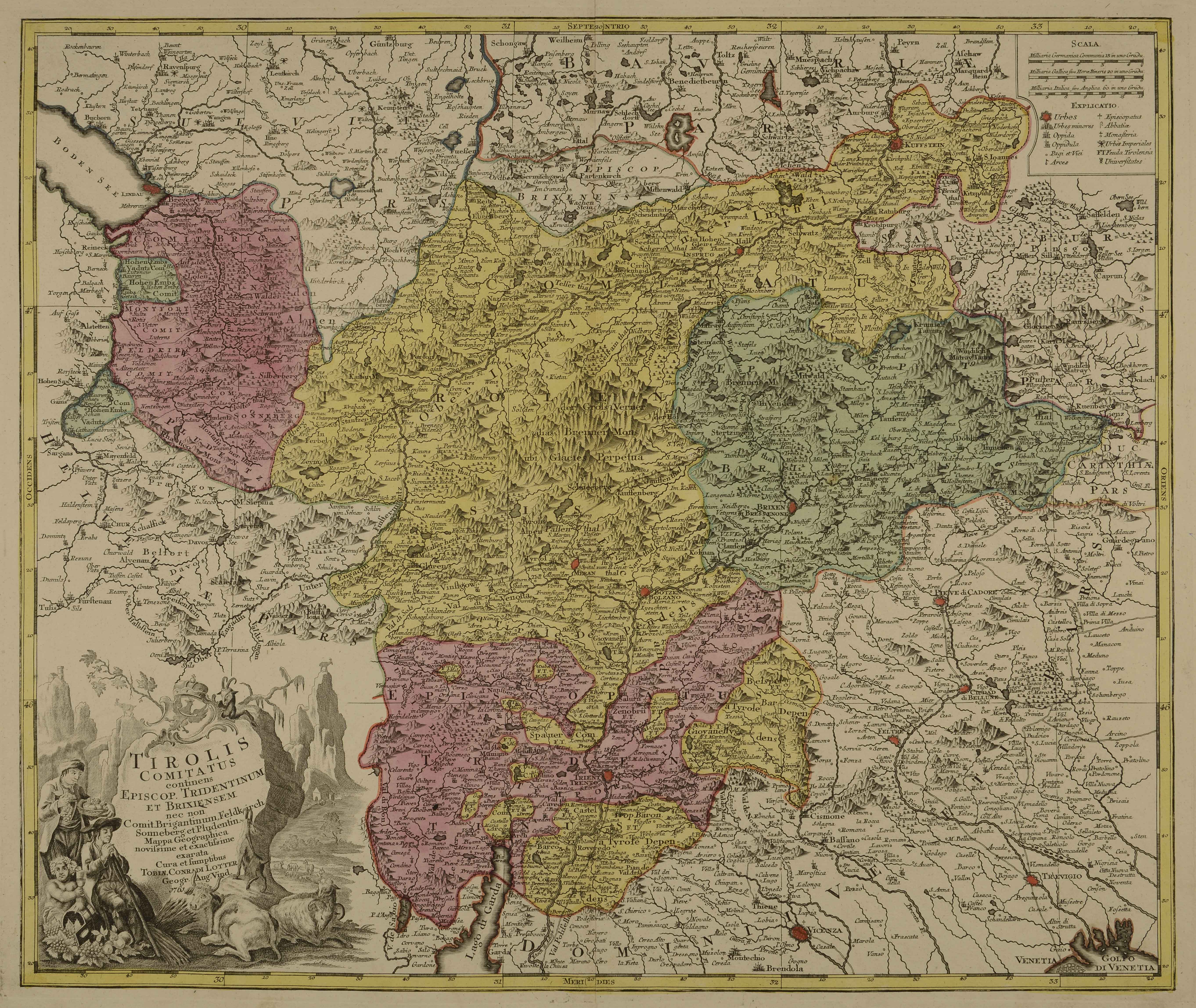 | Tirolis comitatus continens episcop. Tridentinum et Brixiensem nec non comit. Brigantinum, Feldkirch Sonneberg. et Pludentin. mappa geographica novissime et exactissime exarata |