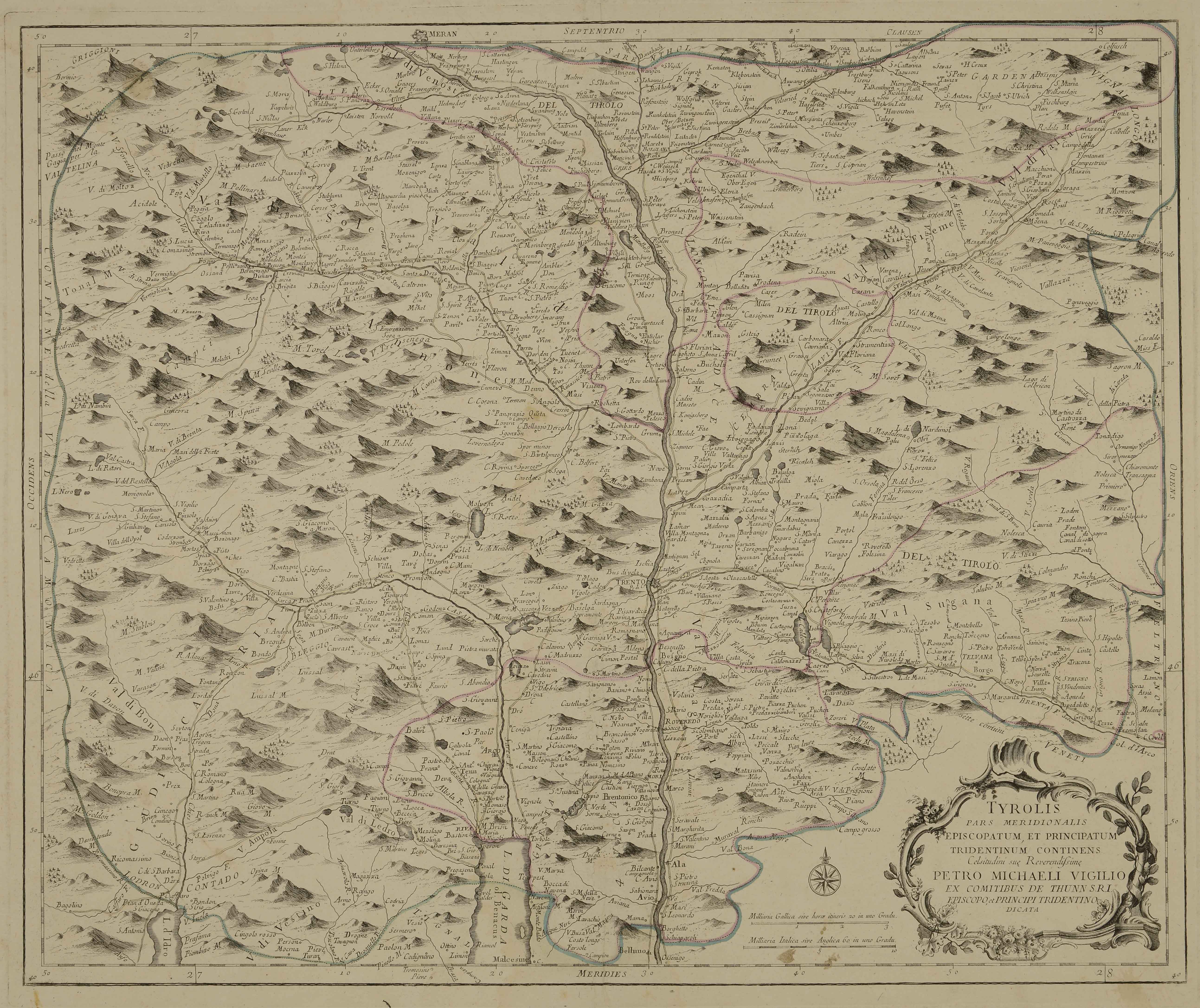 Calcografia; 440x525 mm. Cfr. Gino Tomasi, Il territorio trentino-tirolese nell'antica cartografia, Ivrea, Priuli &, Verlucca, 1997, scheda 75). Stato privo del nome dell'autore, dedica a Pietro Vigilio Thun, stampa attribuibile a Giovanni Battista Monauni o Francesco Michele Battisti