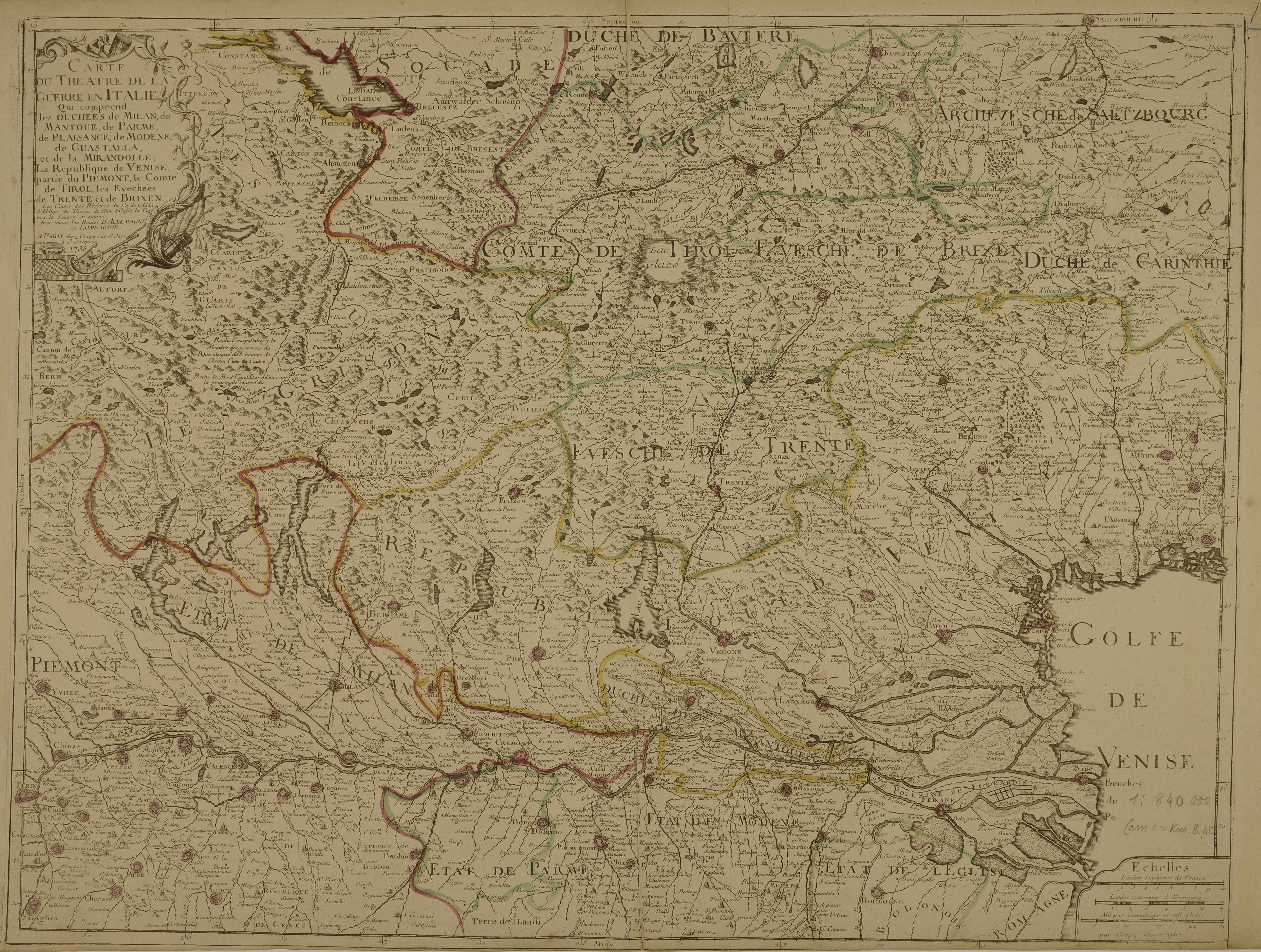 | Carte du theatre de la guerre en Italie qui comprend les Duchées de Milan, de Mantoue, de Parme, de Plaisance, de Modene, de Guastalla et de la Mirandolle, la Republique de Venise, partie du Piemont, le Comte de Tirol, les Evechées de Triente ... |