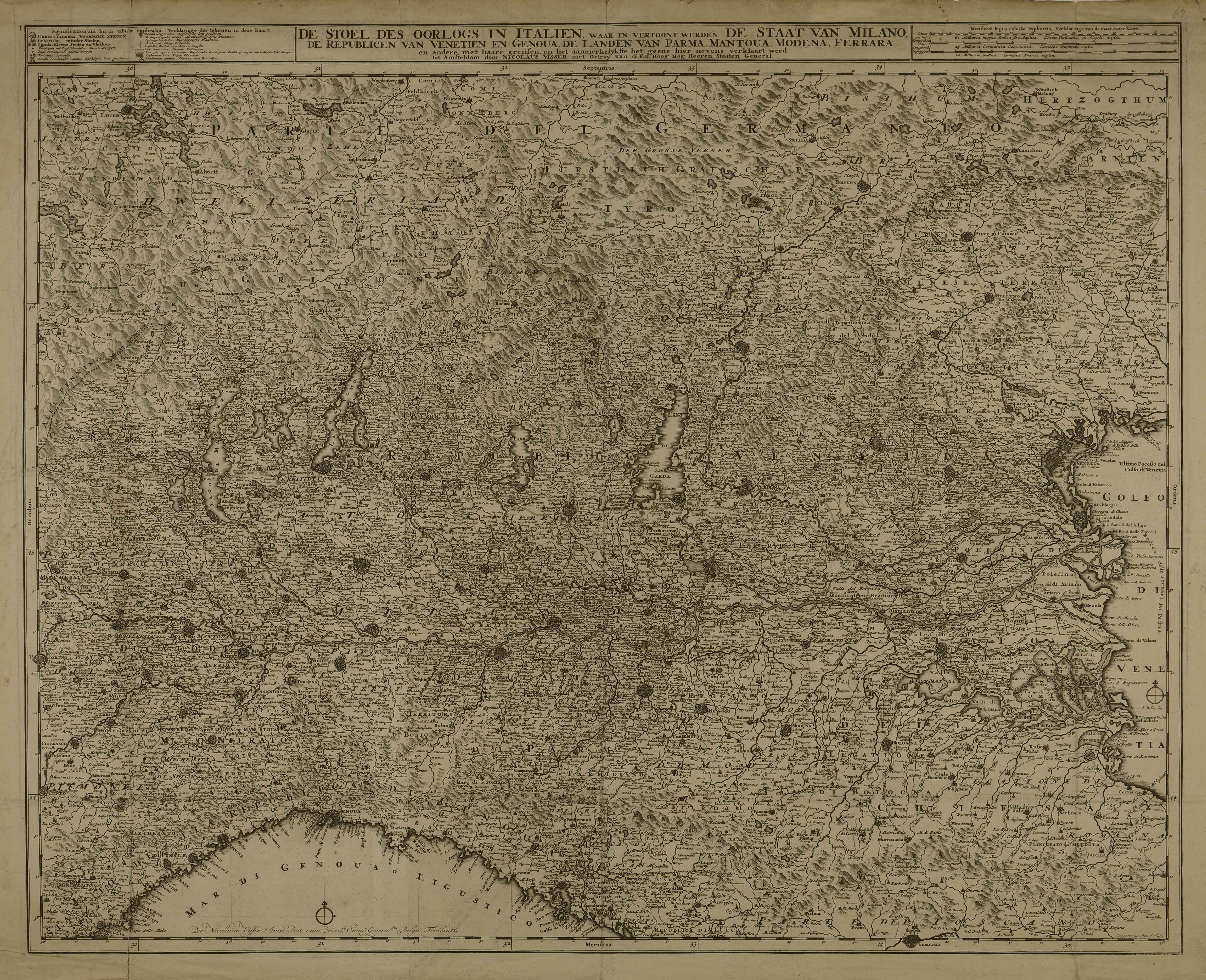 | De stoel des oorlogs in Italien waar in vertoont werden de staat van Milano, de Republicen van Venetien en Genua, de landen van Parma, Mantoua, Modena, Ferrara .... |