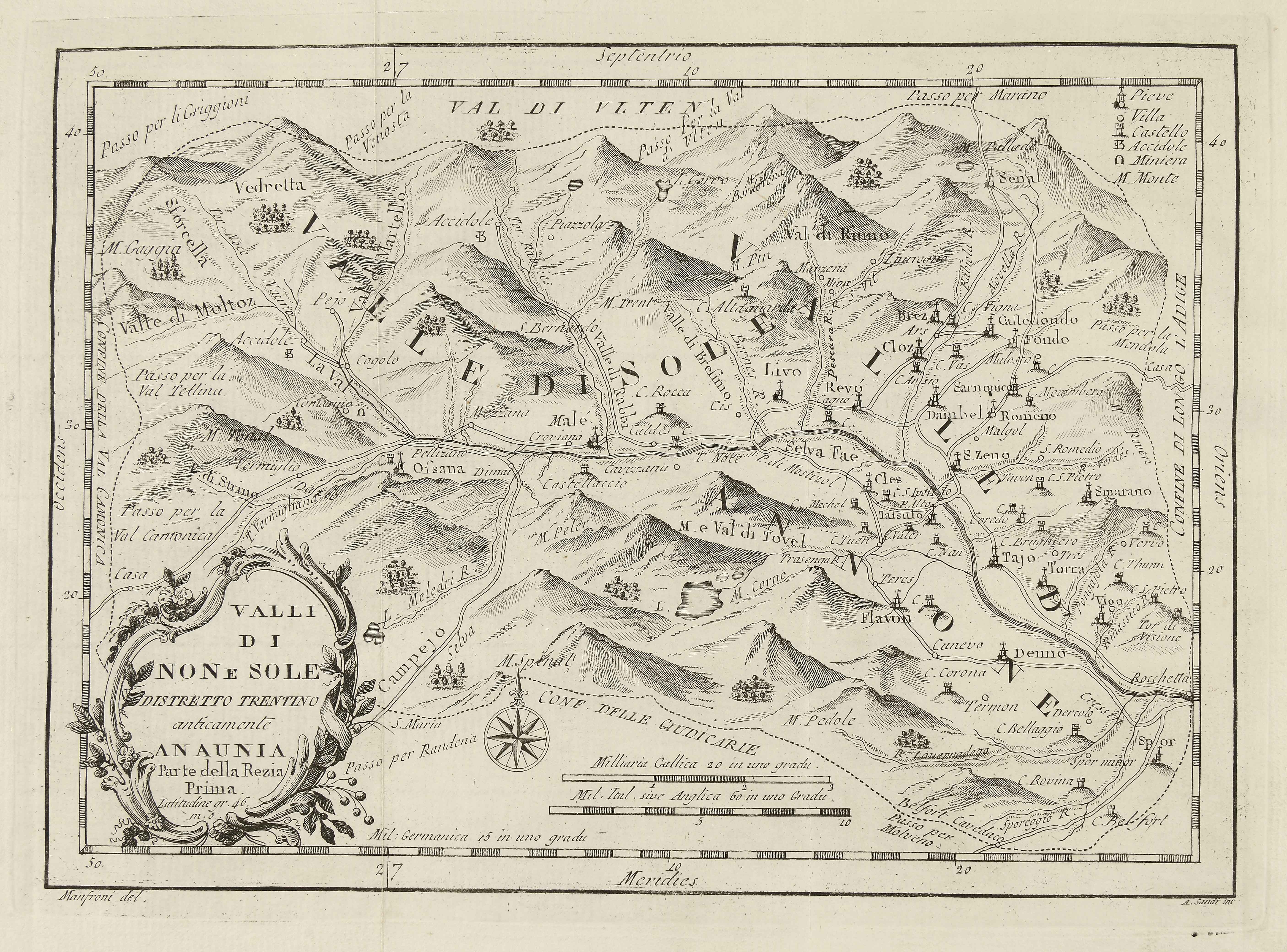 Calcografia; 209x285 mm. Cfr. Gino Tomasi, Il territorio trentino-tirolese nell'antica cartografia, Ivrea, Priuli &, Verlucca, 1997, scheda 77. Pubblicata in Jacopo Antonio Maffei, Periodi istorici e topografia delle valli di Non e sole nel Tirolo meridionale, Rovereto, Marchesani, 1805
