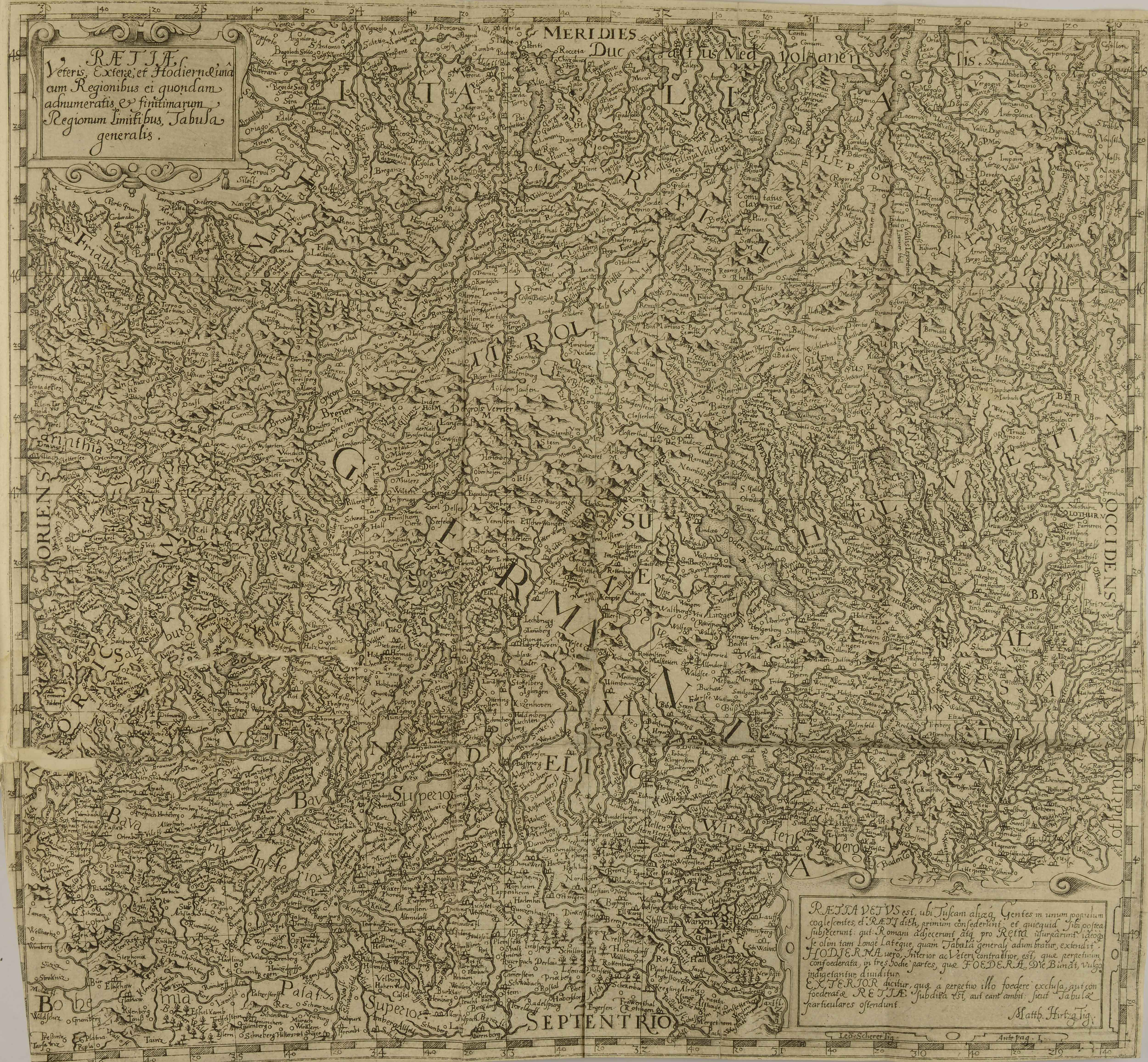 | Raetiae veteris exterae; et hodiernae una cum regionibus ei quondam adnumeratis et finitimarum regionum limitibus tabula generalis |