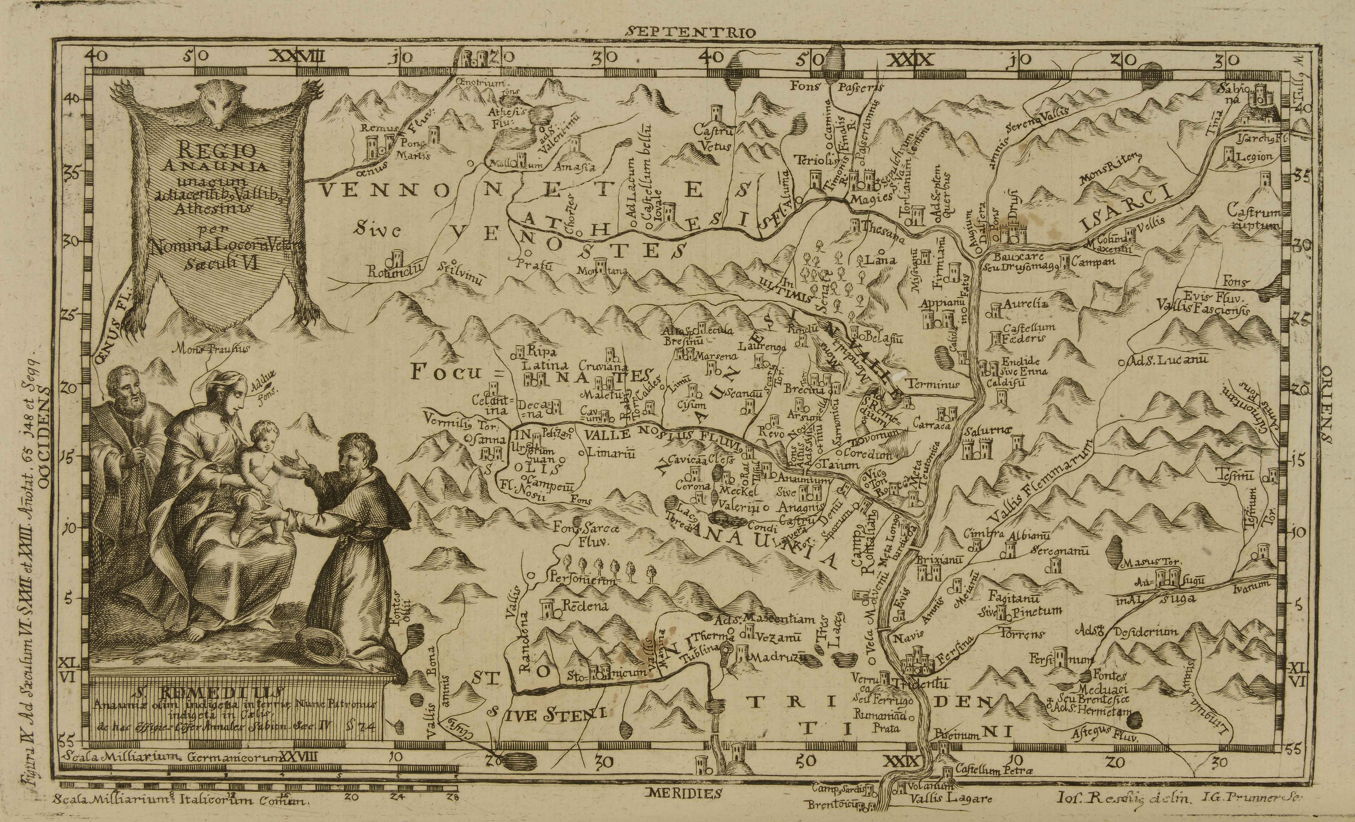 Calcografia; 185x295 mm. Cfr. Gino Tomasi, Il territorio trentino-tirolese nell'antica cartografia, Ivrea, Priuli &, Verlucca, 1997, scheda 115|Pubblicata in Josef Resch, Annales ecclesiae Sabionensis nunc Brixinensis atque conterminarum, Augsburg, Mauracher, 1755