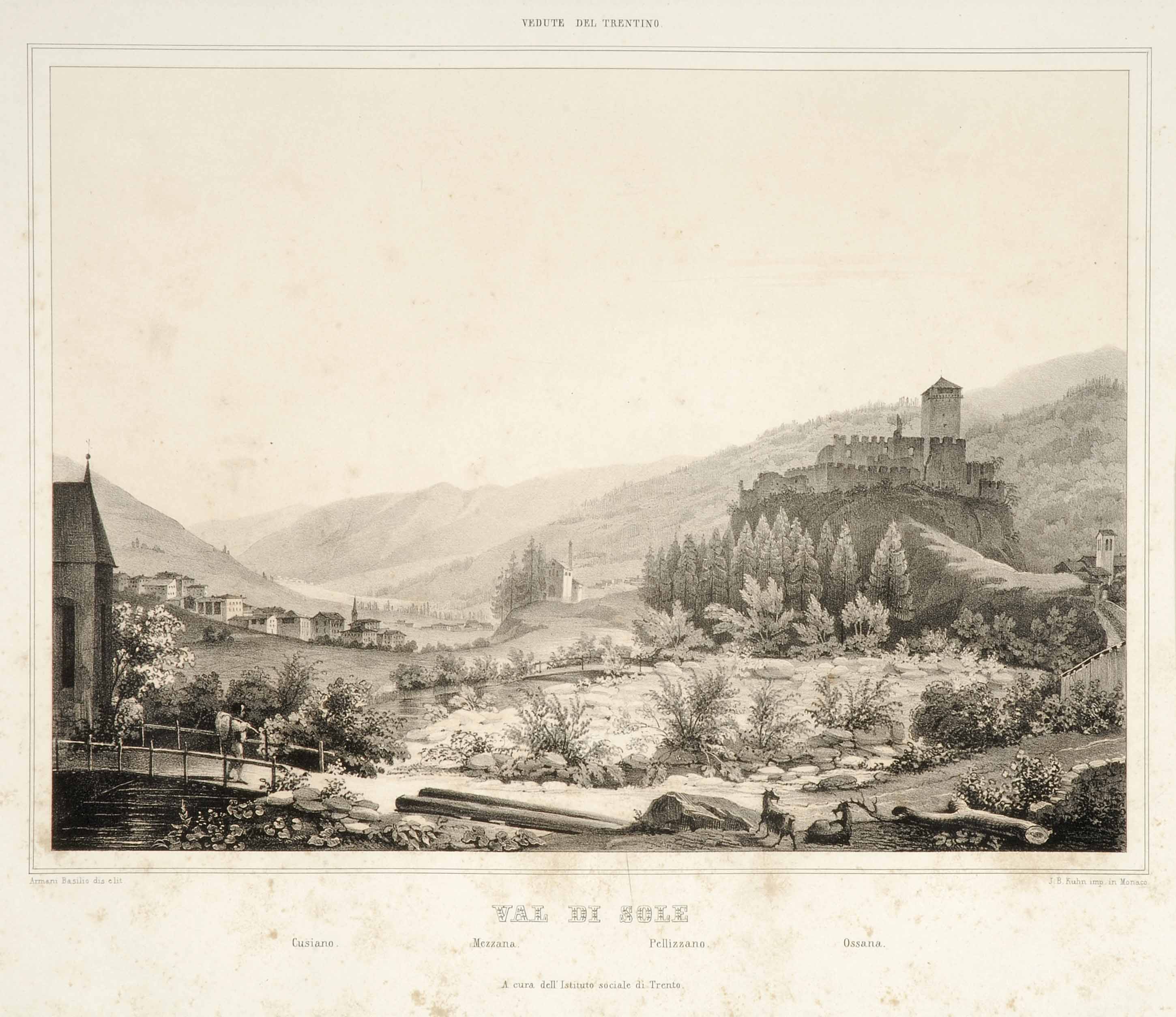 Litografia; 230x312 mm, su foglio 417x599 mm. Disegno e litografia di Basilio Armani, edita a cura dell'Istituto Sociale di Trento e stampata a Monaco da J. B. Kuhn, data di pubblicazione da Basilio Armani, 1817-1899, Panorami dal Garda al Tirolo, Riva del Garda, Comune di Riva del Garda, Museo Civico, 1999, schede 54-67