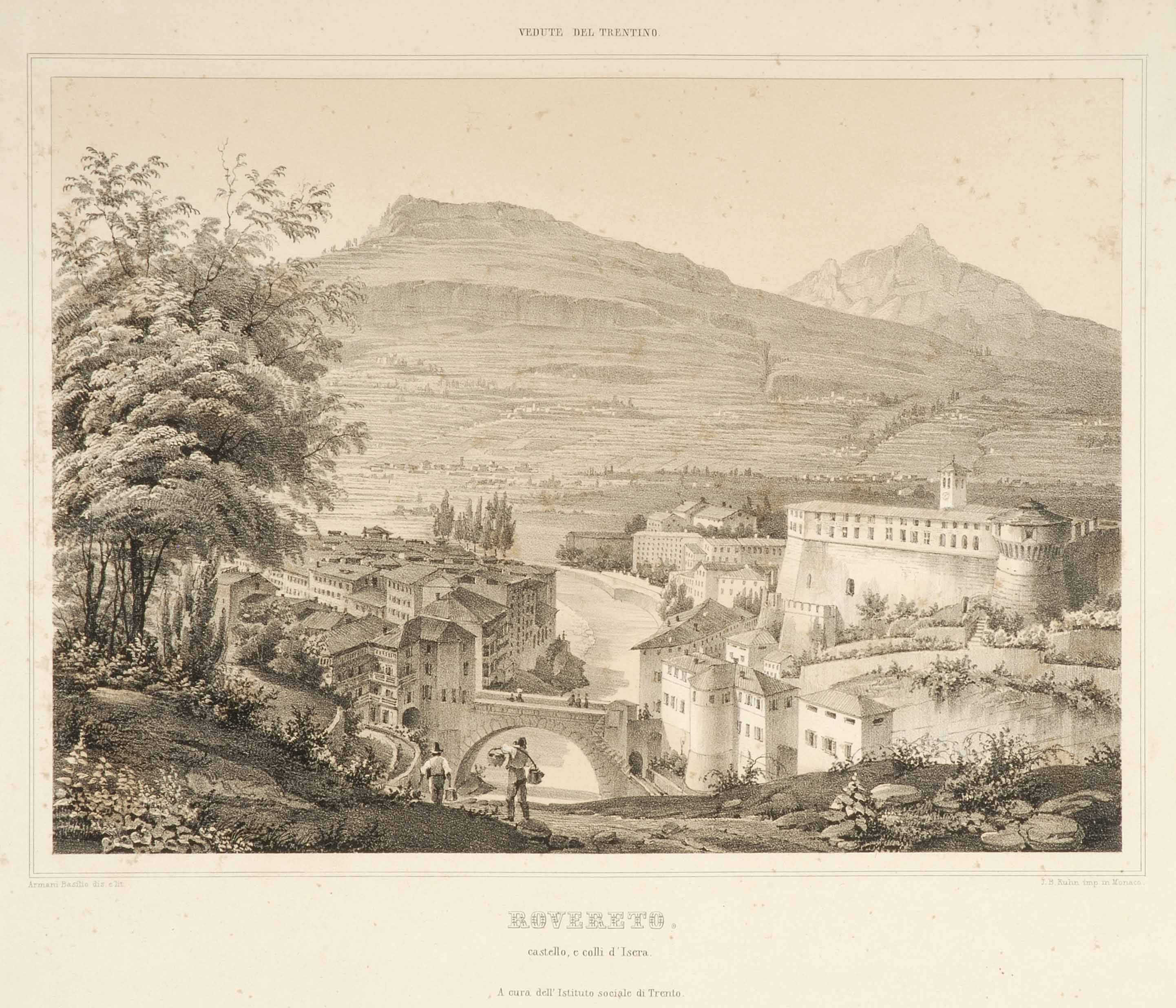 Litografia; 230x312 mm, su foglio 392x575 mm. Disegno e litografia di Basilio Armani, edita a cura dell'Istituto Sociale di Trento e stampata a Monaco da J. B. Kuhn, data di pubblicazione da Basilio Armani, 1817-1899, Panorami dal Garda al Tirolo, Riva del Garda, Comune di Riva del Garda, Museo Civico, 1999, schede 54-67