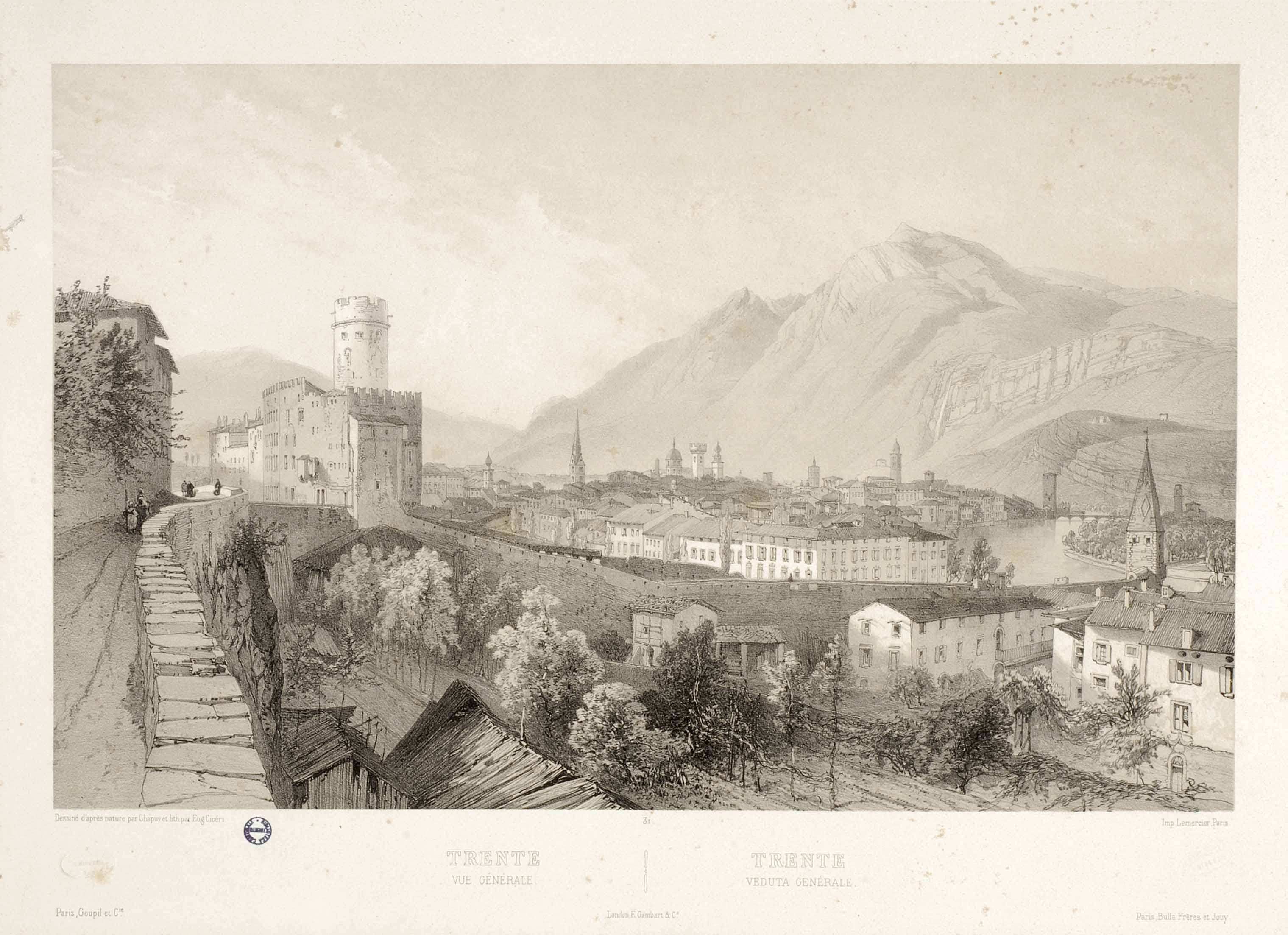 Litografia; 293x474 mm, su foglio 388x560 mm. Disegno di Nicolas Marie-Joseph Chapuy, litografia di Eugène Cicéri,Stampata a Parigi da Lemercier e pubblicata a Parigi da Goupil e Bulla Jouy e a Londra da Gambart &, Co., data di pubblicazione da Aldo Chemelli, Trento nelle stampe d'arte, Trento, Provincia autonoma di Trento, Ufficio beni librari e archivistici, 1990, p. 210