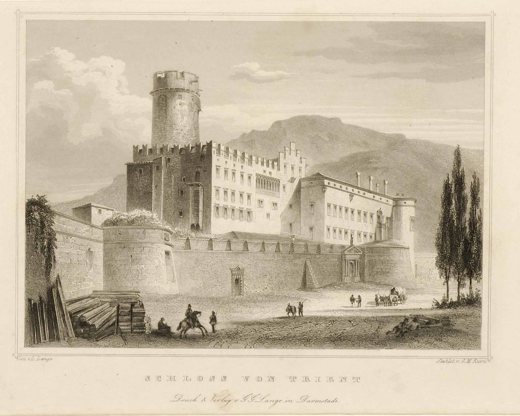Calcografia; 144x224 mm. Disegno di Ludwig Lange, incisione di Georg Michael Kurz, data di pubblicazione da Aldo Chemelli, Trento nelle stampe d'arte, Trento, Provincia autonoma di Trento, Ufficio beni librari e archivistici, 1990, p. 212