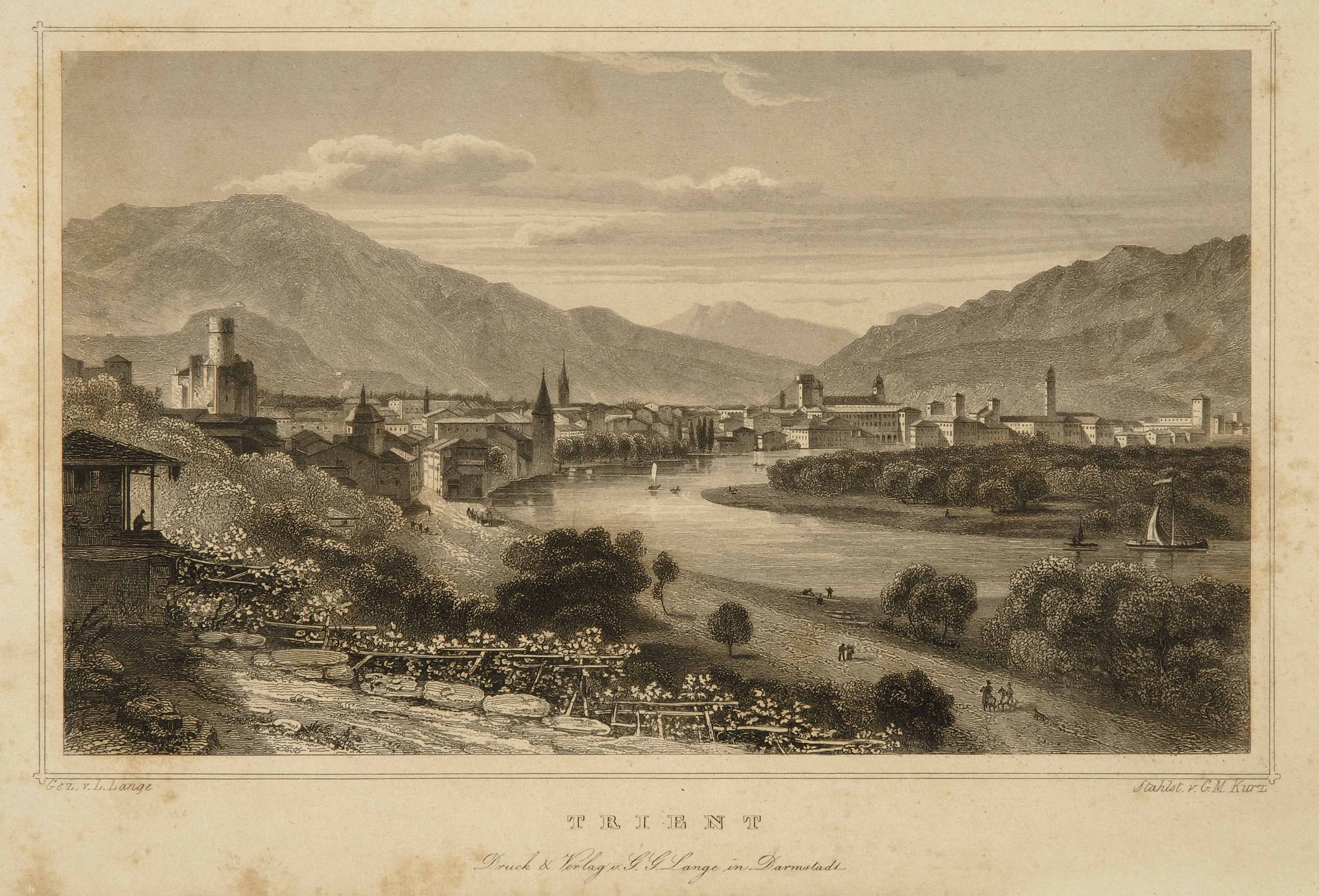 Calcografia; 149x226 mm. Disegno di Ludwig Lange, incisione di Georg Michael Kurz, data di pubblicazione da Aldo Chemelli, Trento nelle stampe d'arte, Trento, Provincia autonoma di Trento, Ufficio beni librari e archivistici, 1990, p. 194
