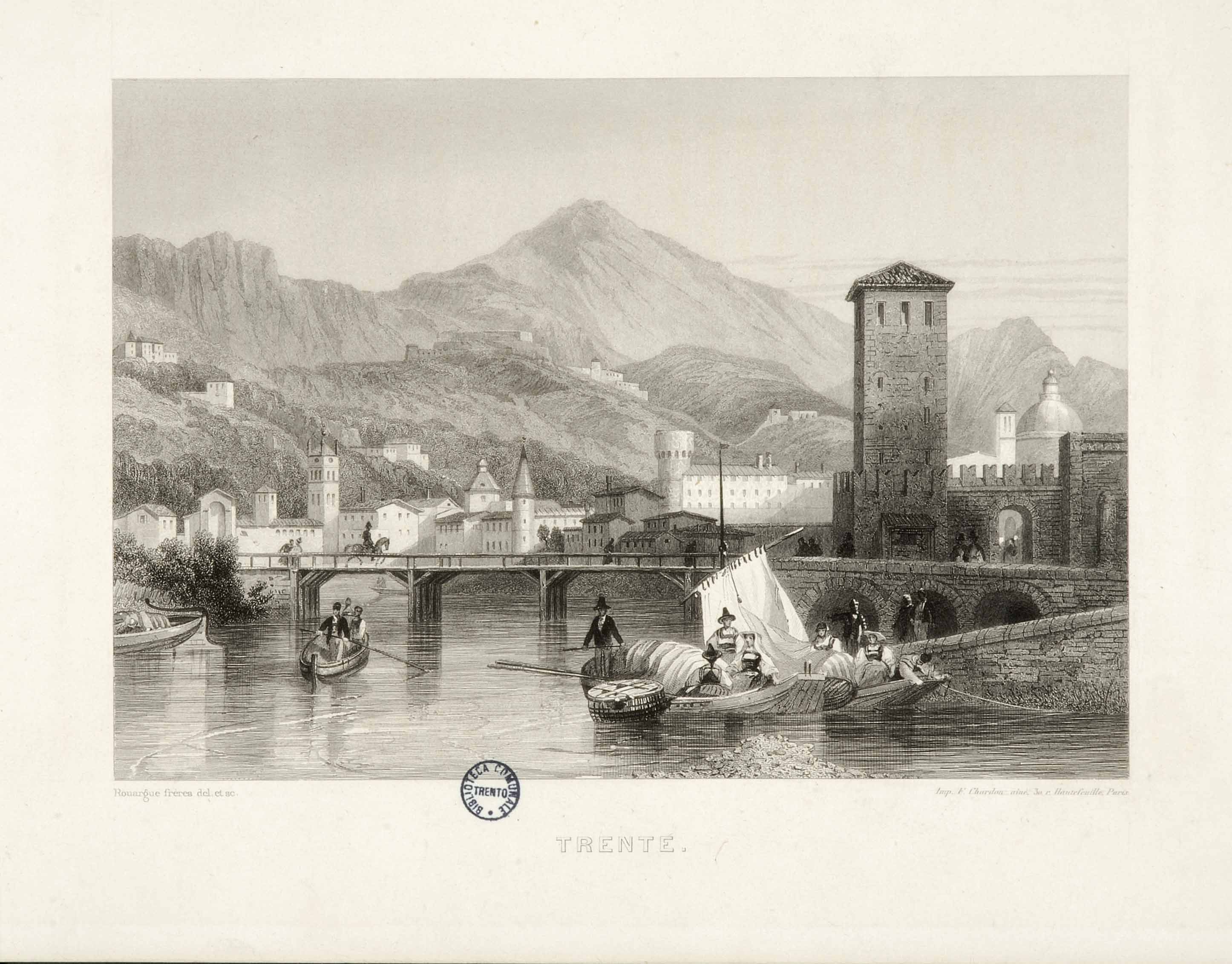 Calcografia; 149x226 mm. Disegno e litografia dei fratelli Adolphe e Emile Rouargue, data di pubblicazione da Aldo Chemelli, Trento nelle stampe d'arte, Trento, Provincia autonoma di Trento, Ufficio beni librari e archivistici, 1990, p. 228