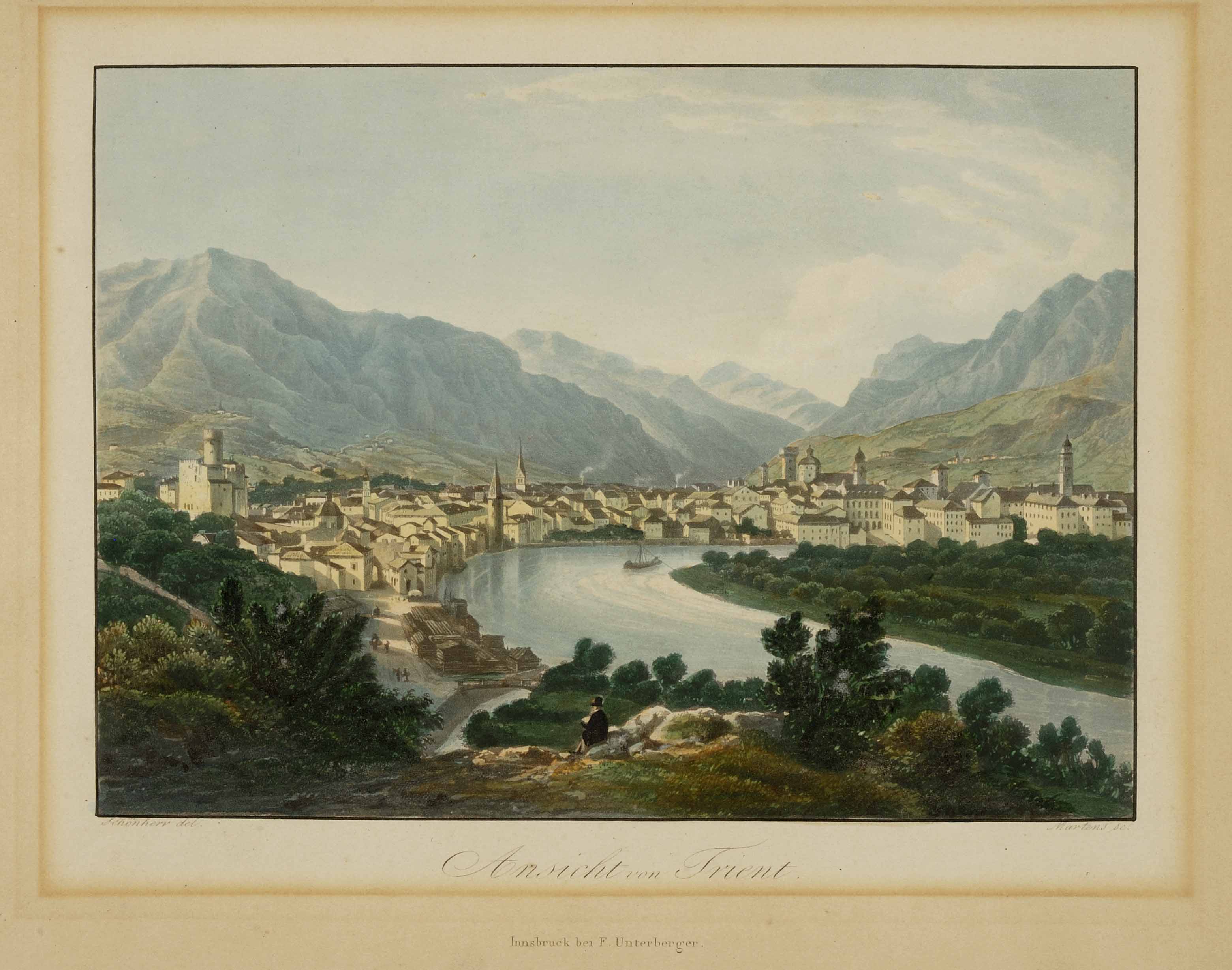 Calcografia; 203x261 mm. Disegno di Joseph Schönherr, incisione di Frédéric Martens, data di pubblicazione da Aldo Chemelli, Trento nelle stampe d'arte, Trento, Provincia autonoma di Trento, Ufficio beni librari e archivistici, 1990, p. 184
