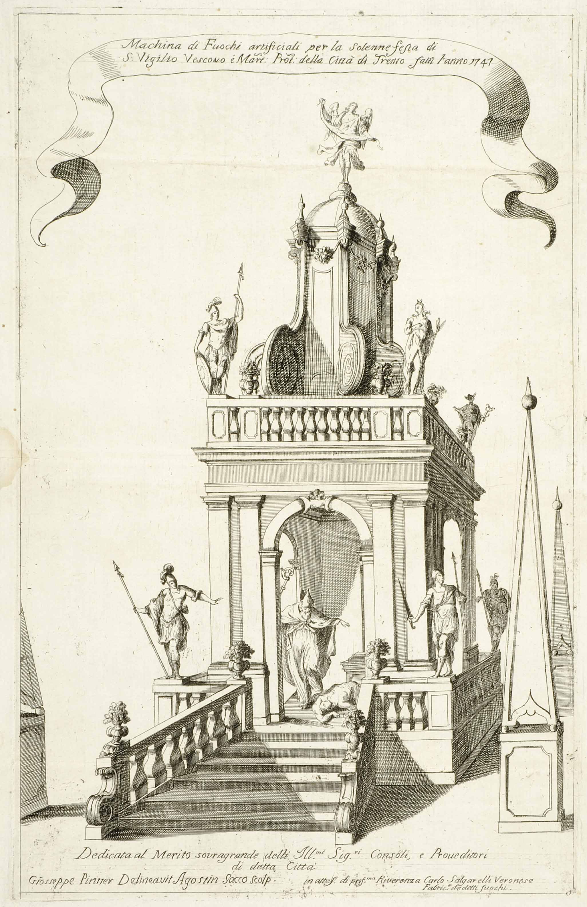 Calcografia; 405x256 mm, 410x264 mm. Disegno di Giuseppe Pinner, incisione di Agostino Sacco, dedica di Carlo Salgarelli \",fabricante de detti fuochi\", ai Consoli e provveditori della città di Trento