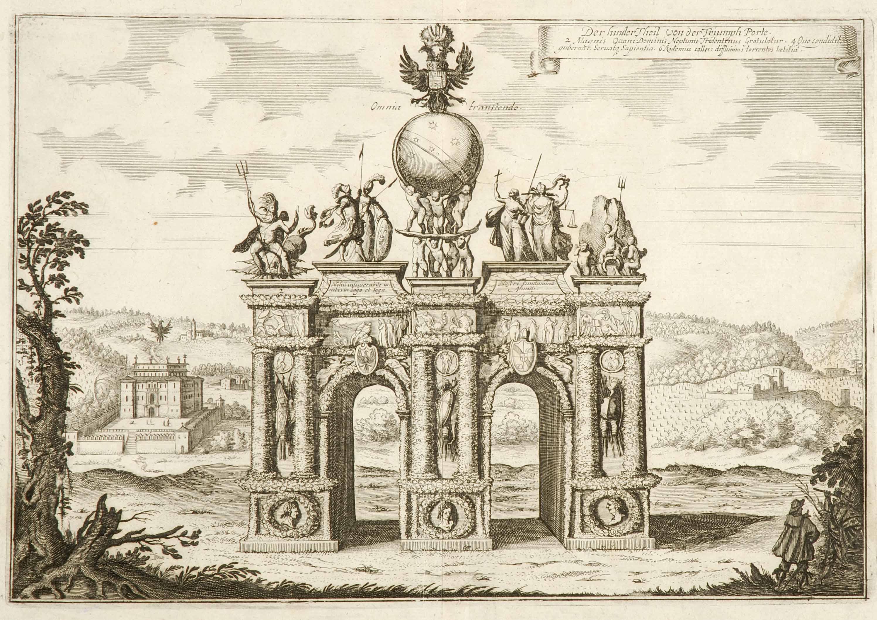 Calcografia, 195x286 mm, 202x292 mm. Disegno attribuito a Ludovico Sardagna, incisione attribuita a Matthäus Merian, pubblicata tra il 1652 e il 1663 a Frankfurt am Main dagli eredi di Matthäus Merian. Cfr. Franco Cappelletti, Imago Tridenti. Incisioni e libri illustrati dal XV al XVIII secolo, Trento, Biblioteca comunale di Trento, 1996, pp. 117-119