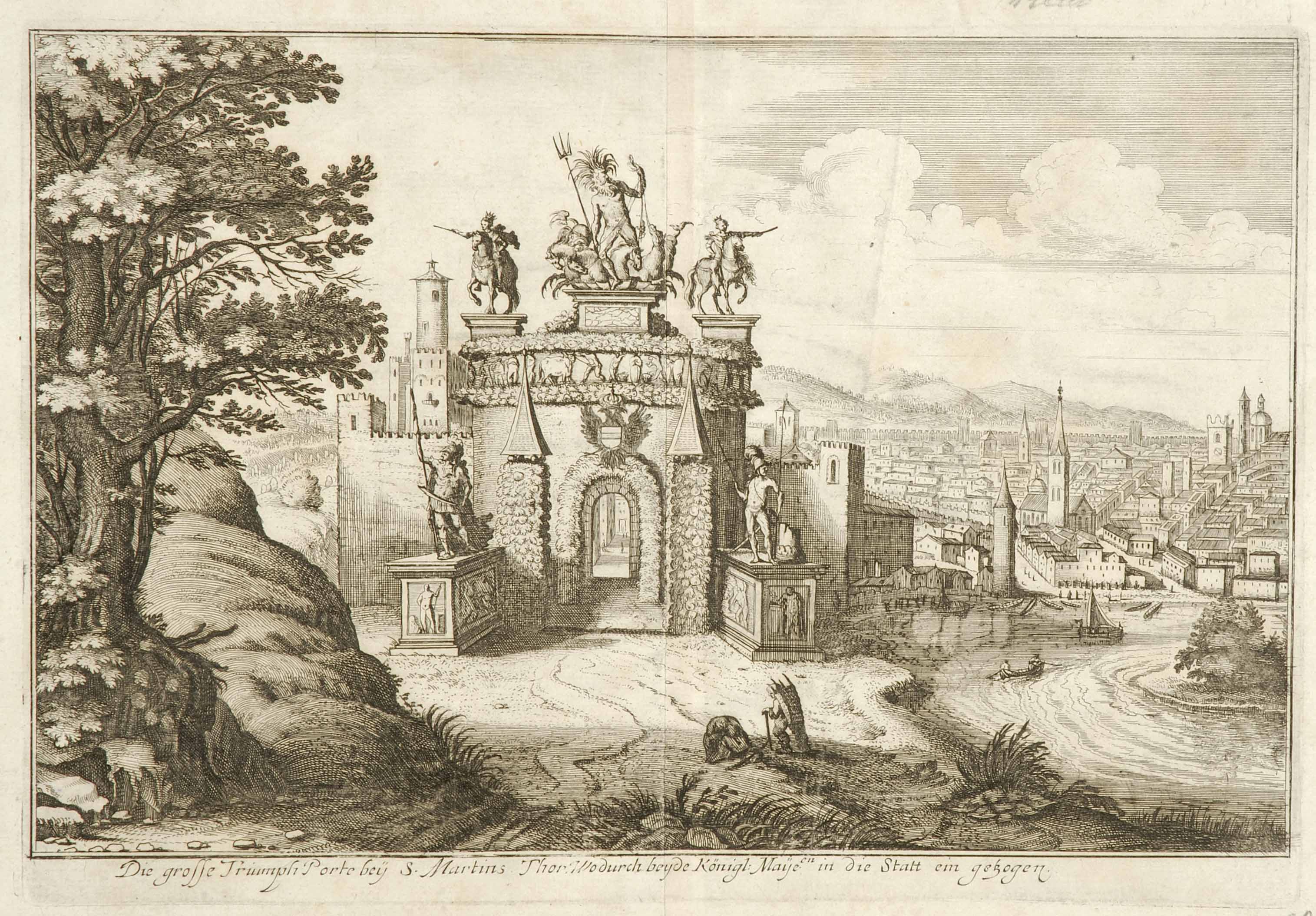 | Die grosse Triumph Porte bey S. Martinus Thor wodurch beyde Königl. Maye.en in die Stadt ein getzogen |