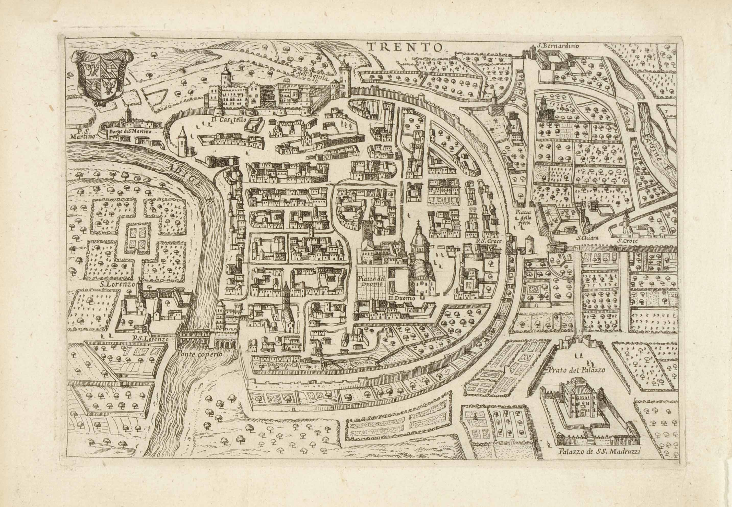 Calcografia; 121x176 mm, 125x180 mm. Pubblicata tra il 1699 e il 1761 a Roma da Michelangelo e Pier Vincenzo Rossi (1699, 1700, 1717) e Fausto Amidei (1737, 1747, 1761), date di pubblicazione e note tipografiche da Franco Cappelletti, Imago Tridenti. Incisioni e libri illustrati dal XV al XVIII secolo, Trento, Biblioteca comunale di Trento, 1996, pp. 113-116