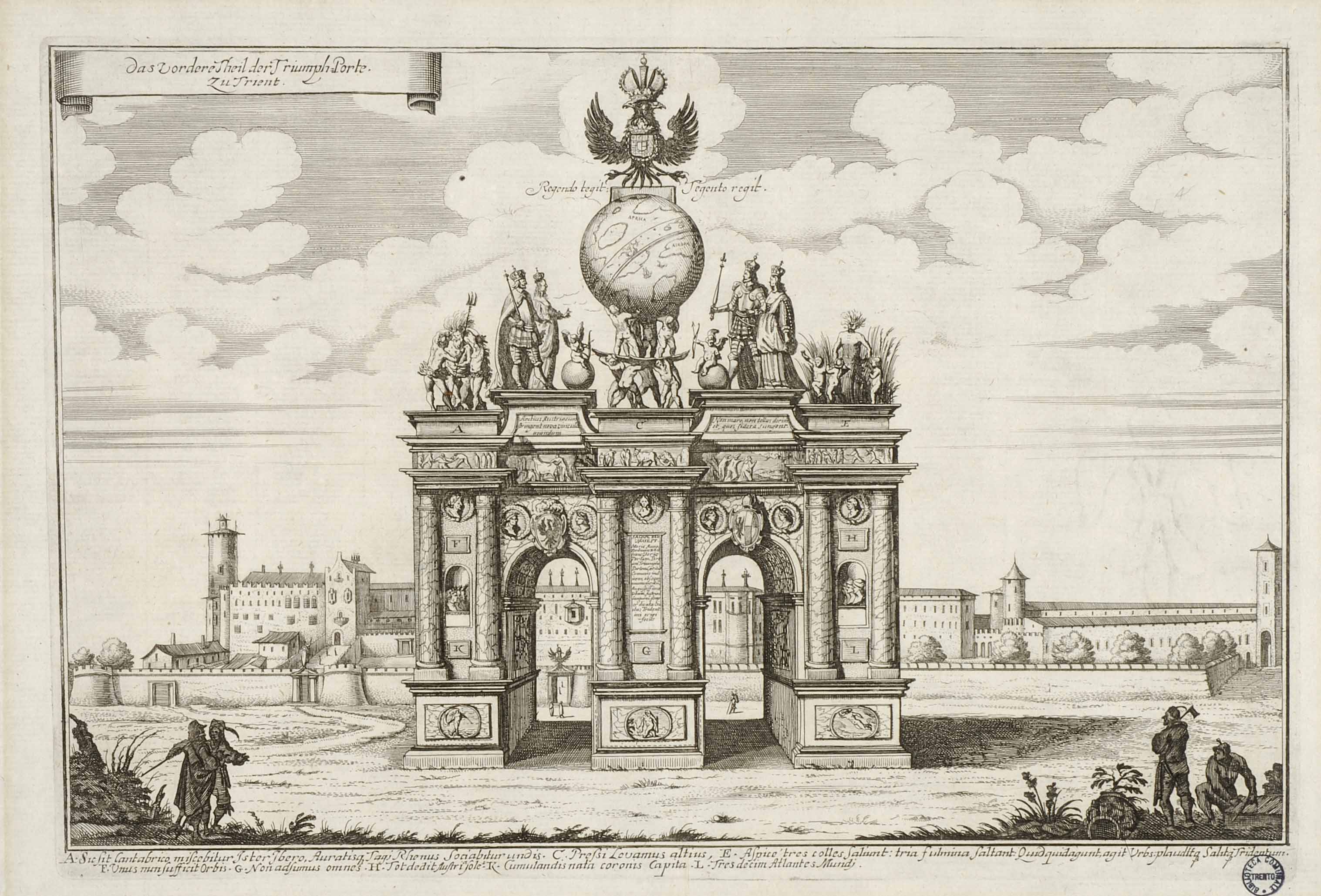 Calcografia, 192x294 mm, 219x318 mm. Disegno attribuito a Ludovico Sardagna, incisione attribuita a Matthäus Merian, pubblicata tra il 1652 e il 1663 a Frankfurt am Main dagli eredi di Matthäus Merian. Cfr. Franco Cappelletti, Imago Tridenti. Incisioni e libri illustrati dal XV al XVIII secolo, Trento, Biblioteca comunale di Trento, 1996, pp. 121-122
