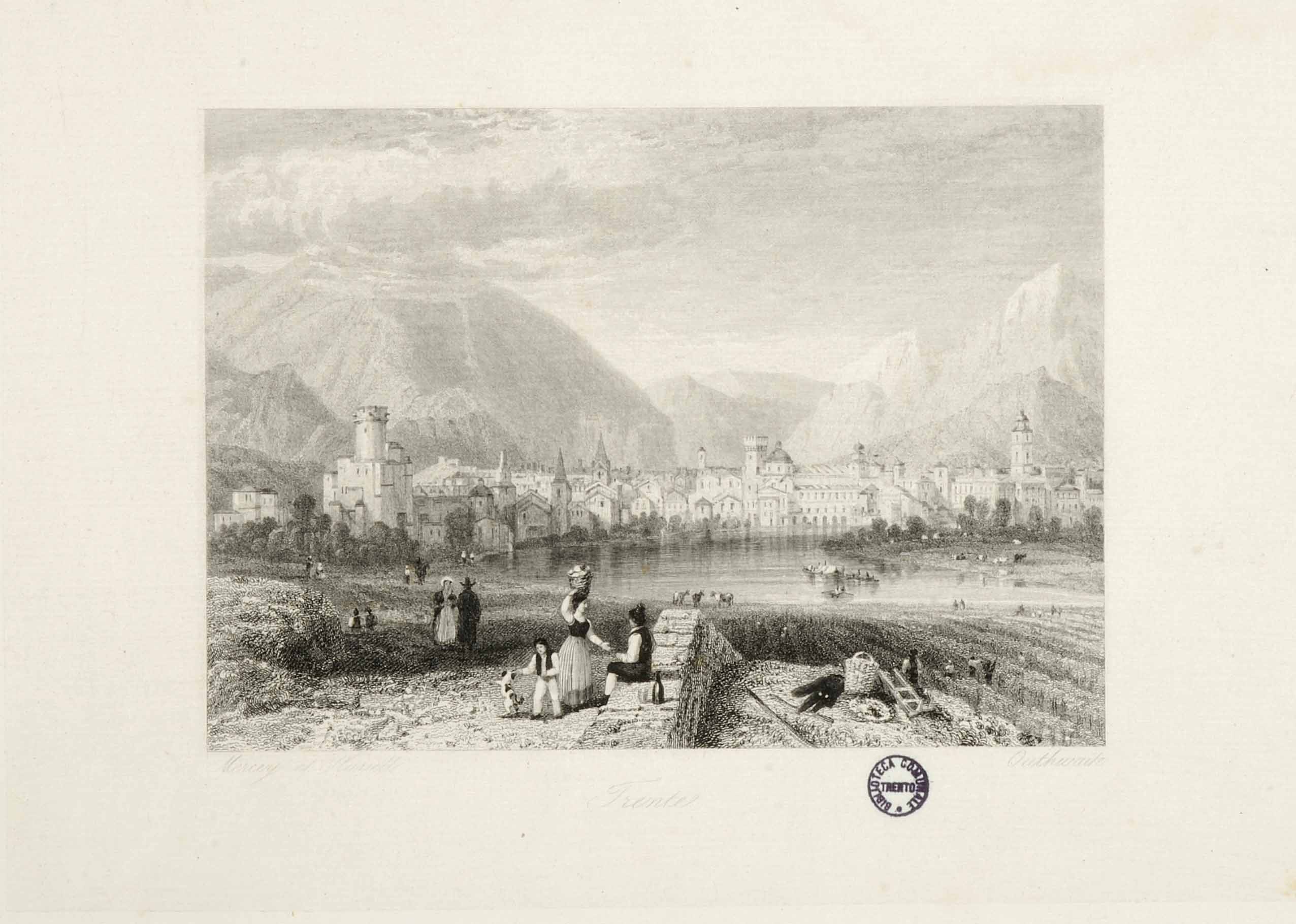 Calcografia; 105x147 mm, 150x214 mm. Disegno di Frédéric Mercey e Robert Havell, incisione di Jean Jacques Outhwaite, data di pubblicazione da Aldo Chemelli, Carlo Perini, Marcus Perini, Trento illustrata. La città e il territorio in piante e vedute dal XVI al XX secolo, Padova, Studio editoriale Programma, 1991, pp. 62-63