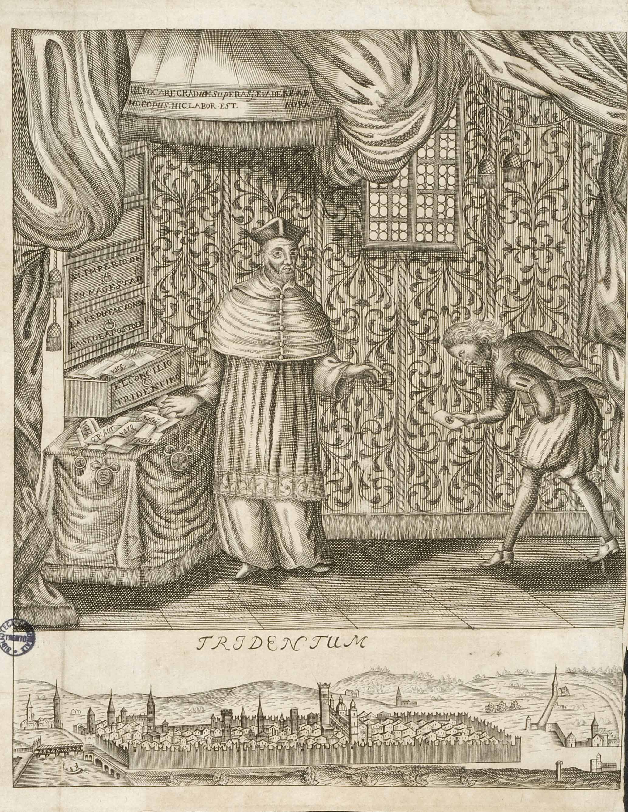 Calcografia; 202x162 mm. Note tipografiche e data di pubblicazione da Franco Cappelletti, Imago Tridenti. Incisioni e libri illustrati dal XV al XVIII secolo, Trento, Biblioteca comunale di Trento, 1996, pp. 199