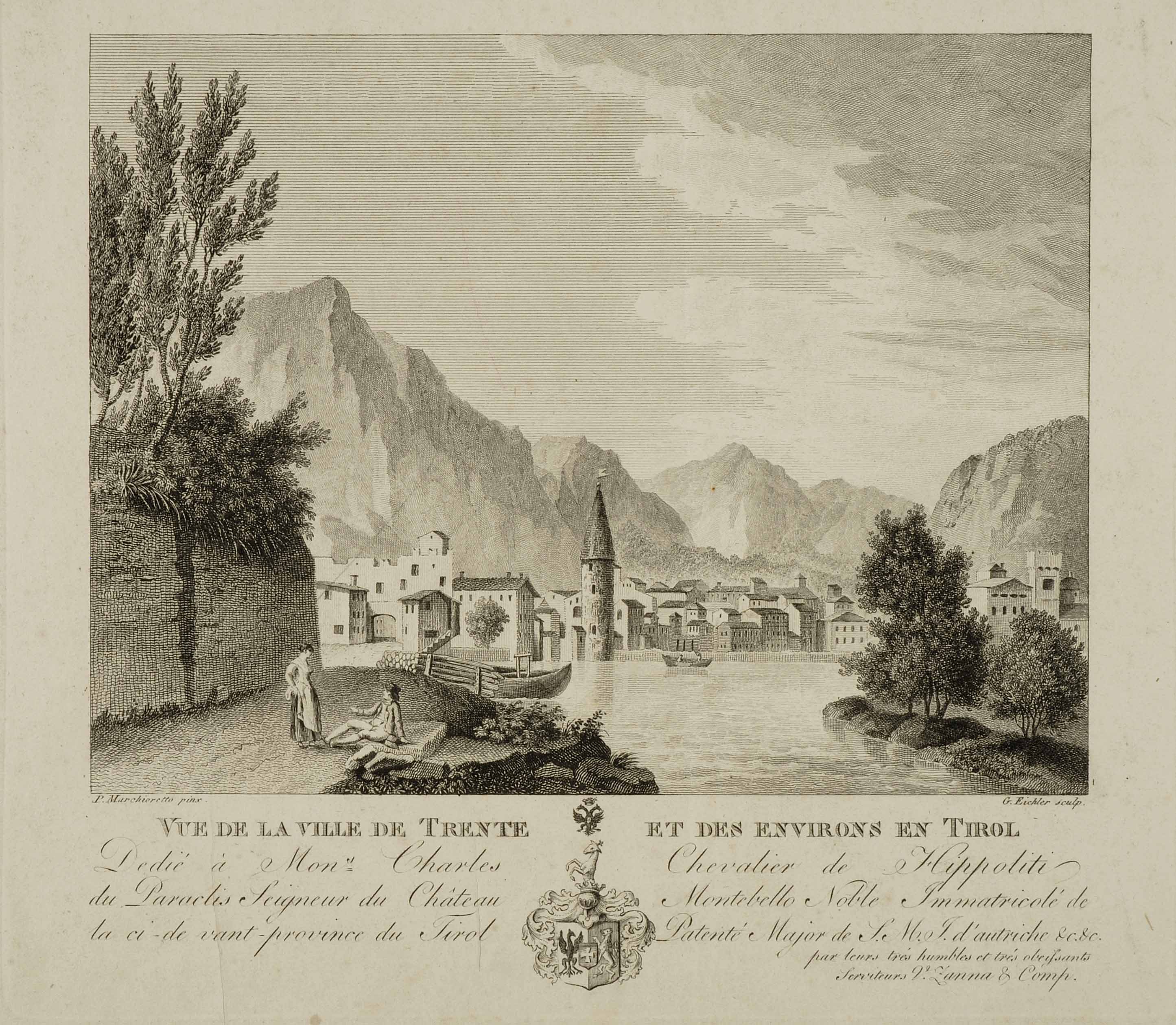 Calcografia; 152x200 mm, 210x235 mm. Disegno di Pietro Marchioretto, incisione di Gottfried Eichler, dedica a Carlo Ippoliti de' Paradiso, note tipografiche da Aldo Chemelli, Trento nelle stampe d'arte, Trento, Provincia autonoma di Trento, Ufficio beni librari e archivistici, 1990, p. 180