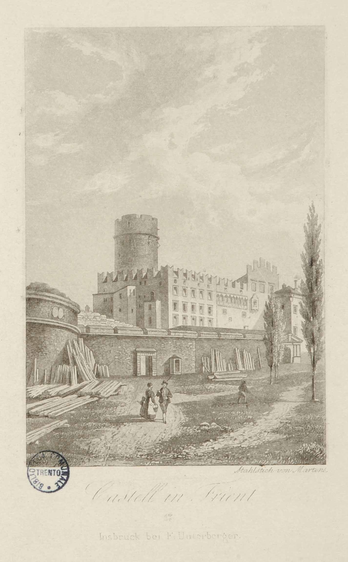Calcografia; 101x69 mm, 184x136 mm. Disegno di Joseph Schönherr, incisione di Frédéric Martens, pubblicata probabilmente intorno al 1840 (cfr. Aldo Chemelli, Trento nelle stampe d'arte, Trento, Provincia autonoma di Trento, Ufficio beni librari e archivistici, 1990, p. 218)