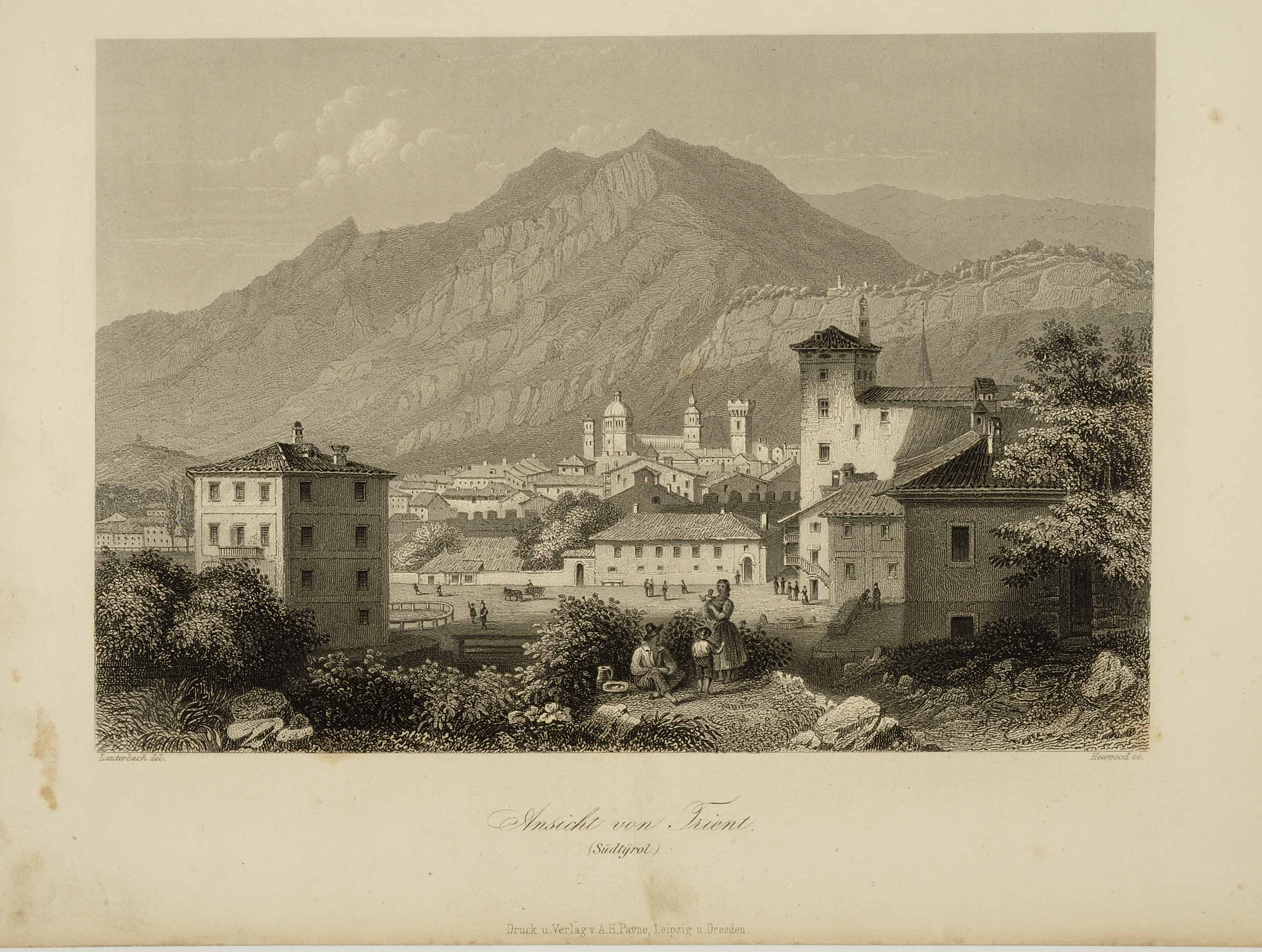 Calcografia; 145x216 mm, 207x276 mm. Disegno di Franz Lauterbach, incisione di Thomas Heawood, pubblicata probabilmente intorno al 1880 (cfr. Aldo Chemelli, Trento nelle stampe d'arte, Trento, Provincia autonoma di Trento, Ufficio beni librari e archivistici, 1990, p. 254)