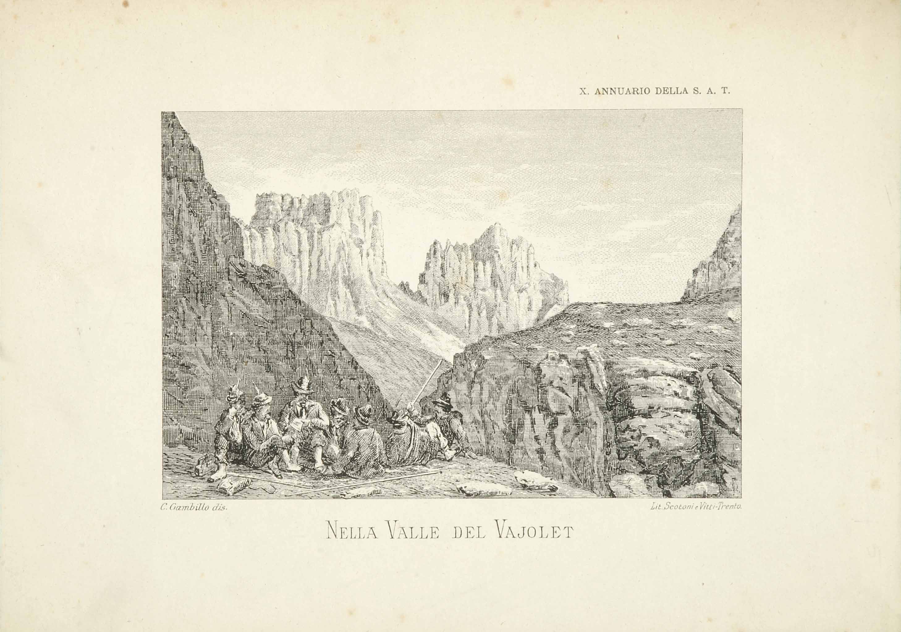 Litografia; 95x144 mm, su foglio 158x223 mm. Disegno di Carlo Gambillo, pubblicato in Annuario della Società degli alpinisti tridentini, A. X (1883-1884)