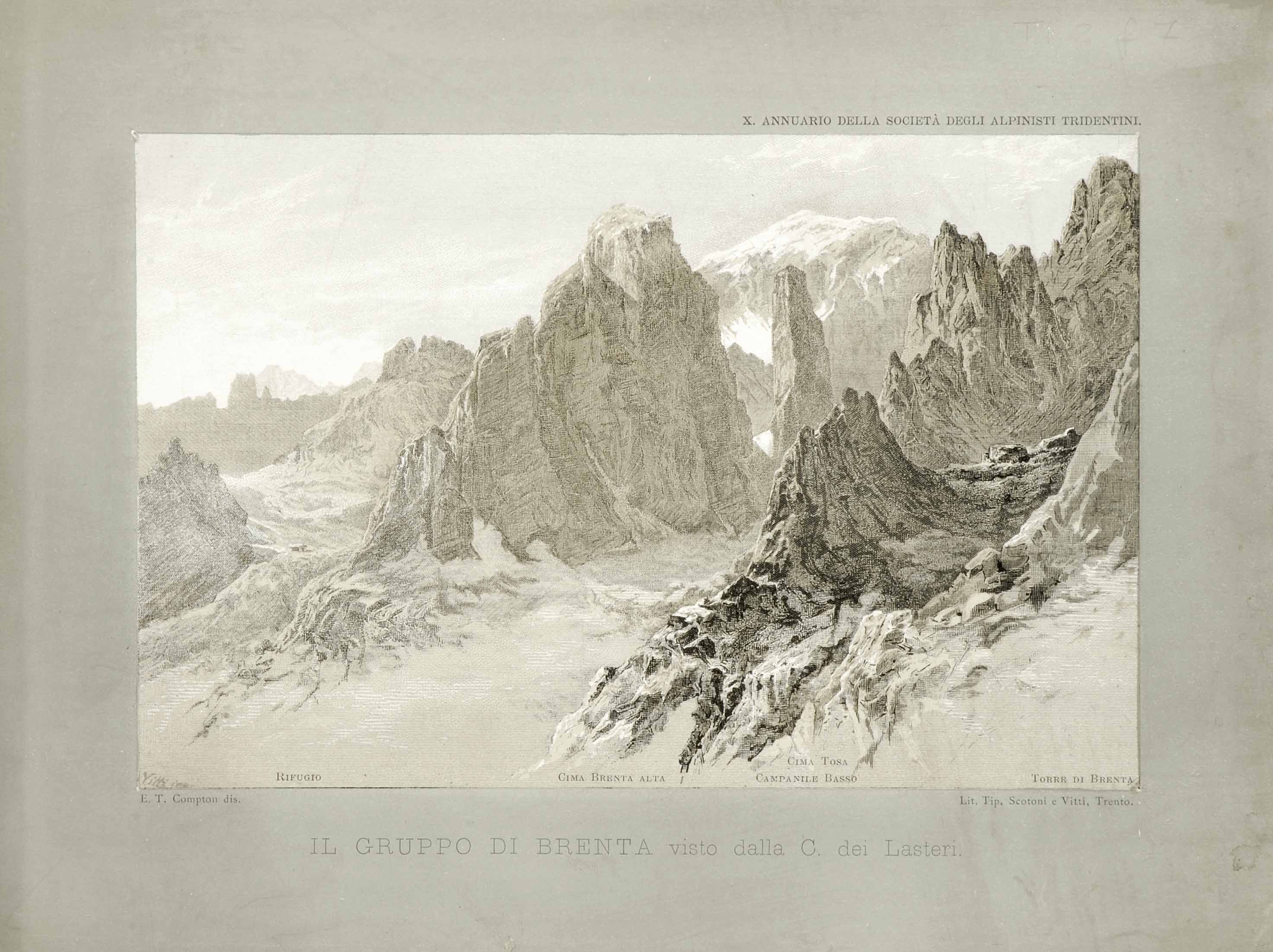 Litografia; 130x200 mm, su foglio 196x268 mm. Disegno di Edward Theodor Compton, pubblicata in Annuario della Società degli alpinisti tridentini, A. X (1883-1884)
