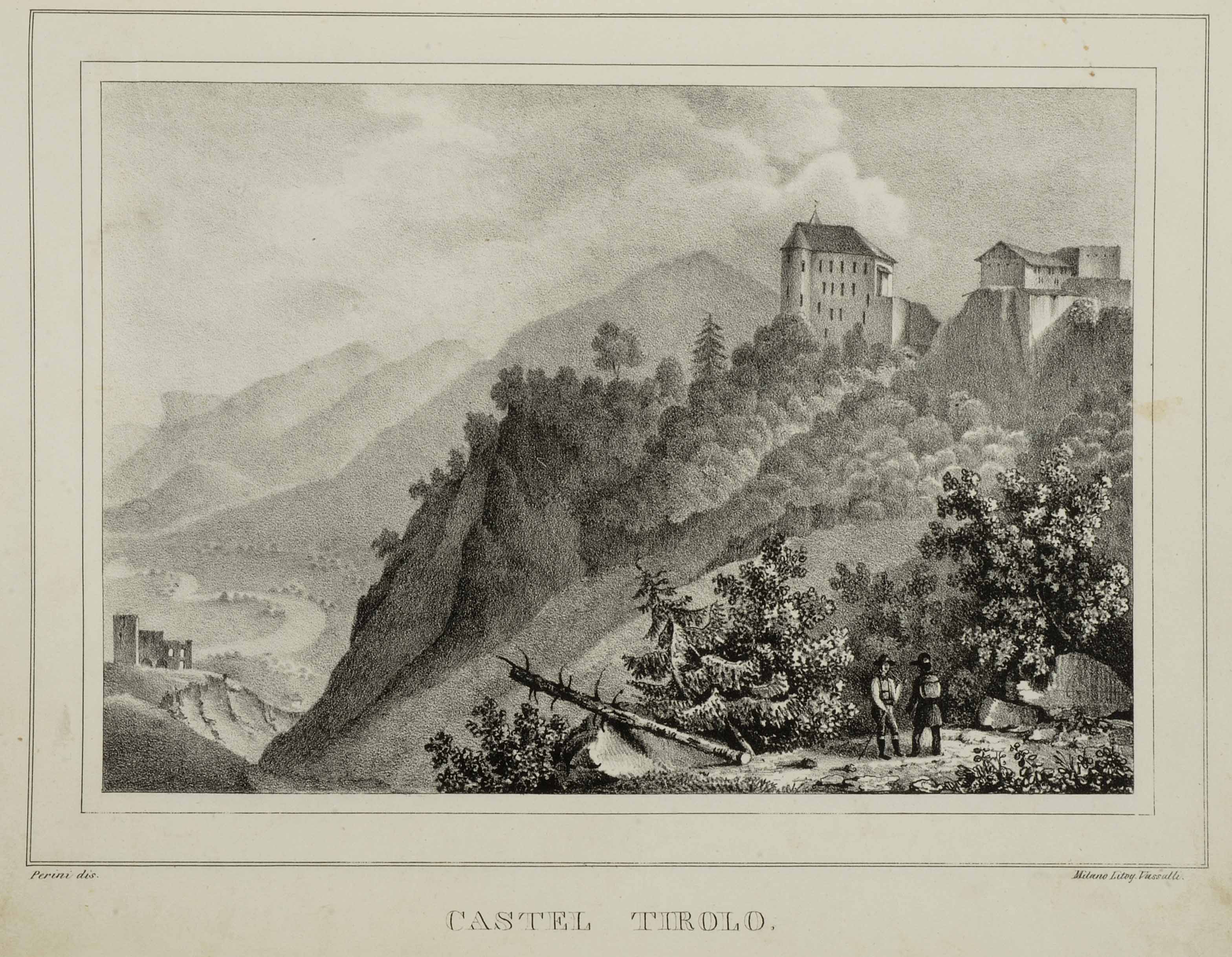 Litografia; 196x270 mm, su foglio 238x312 mm. Disegno di Agostino Perini, litografia effettuata dalla ditta Vassalli di Milano, pubblicata in Agostino Perini, I castelli del Tirolo colla storia delle relative antiche potenti famiglie, Milano, Pirrotta, a spese di Giuseppe Antonio Marietti, 1834-1839