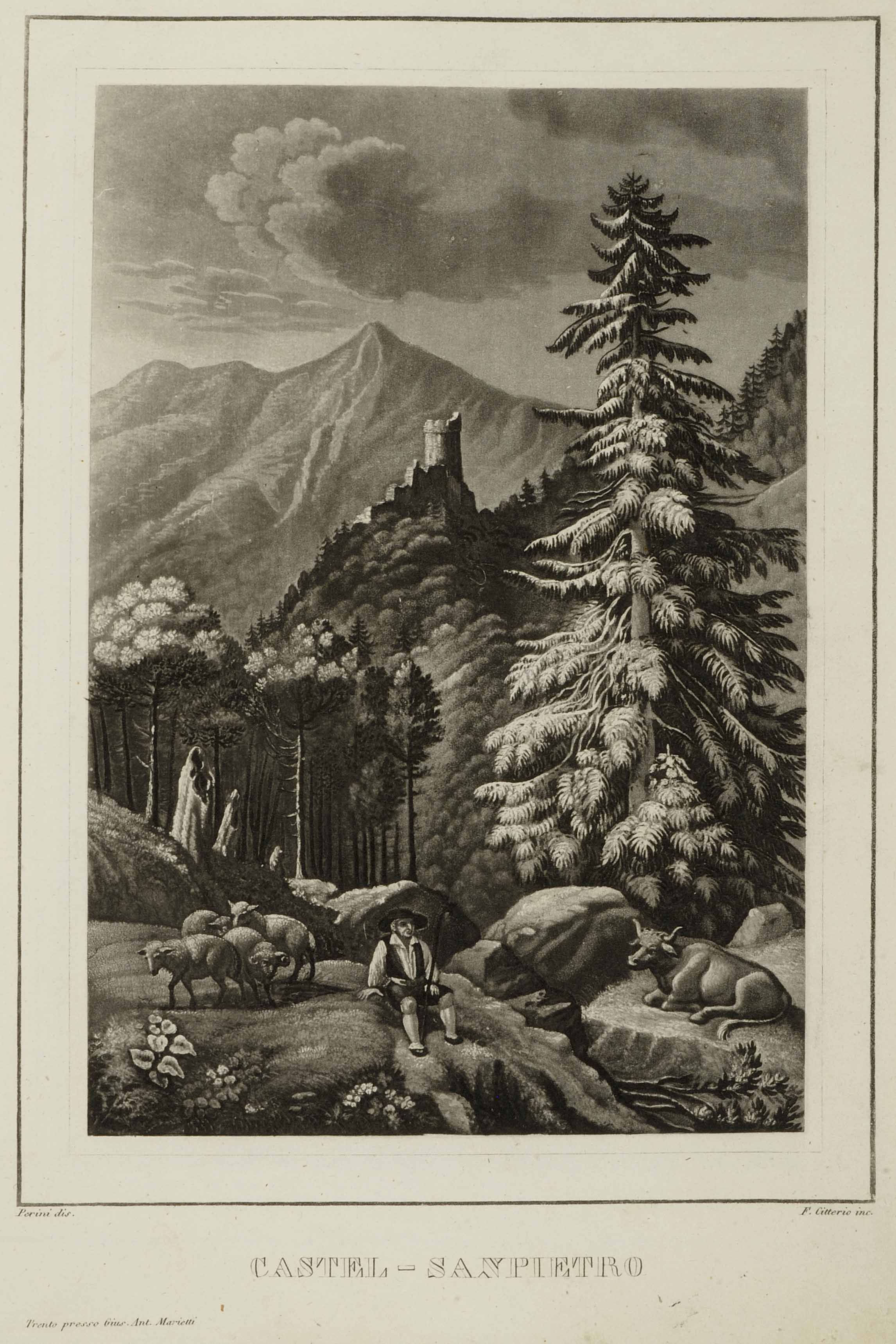 Calcografia; 257x185 mm, 304x230 mm. Disegno di Agostino Perini, incisione di Francesco Citterio, pubblicata in Agostino Perini, I castelli del Tirolo colla storia delle relative antiche potenti famiglie, Milano, Pirrotta, a spese di Giuseppe Antonio Marietti, 1834-1839