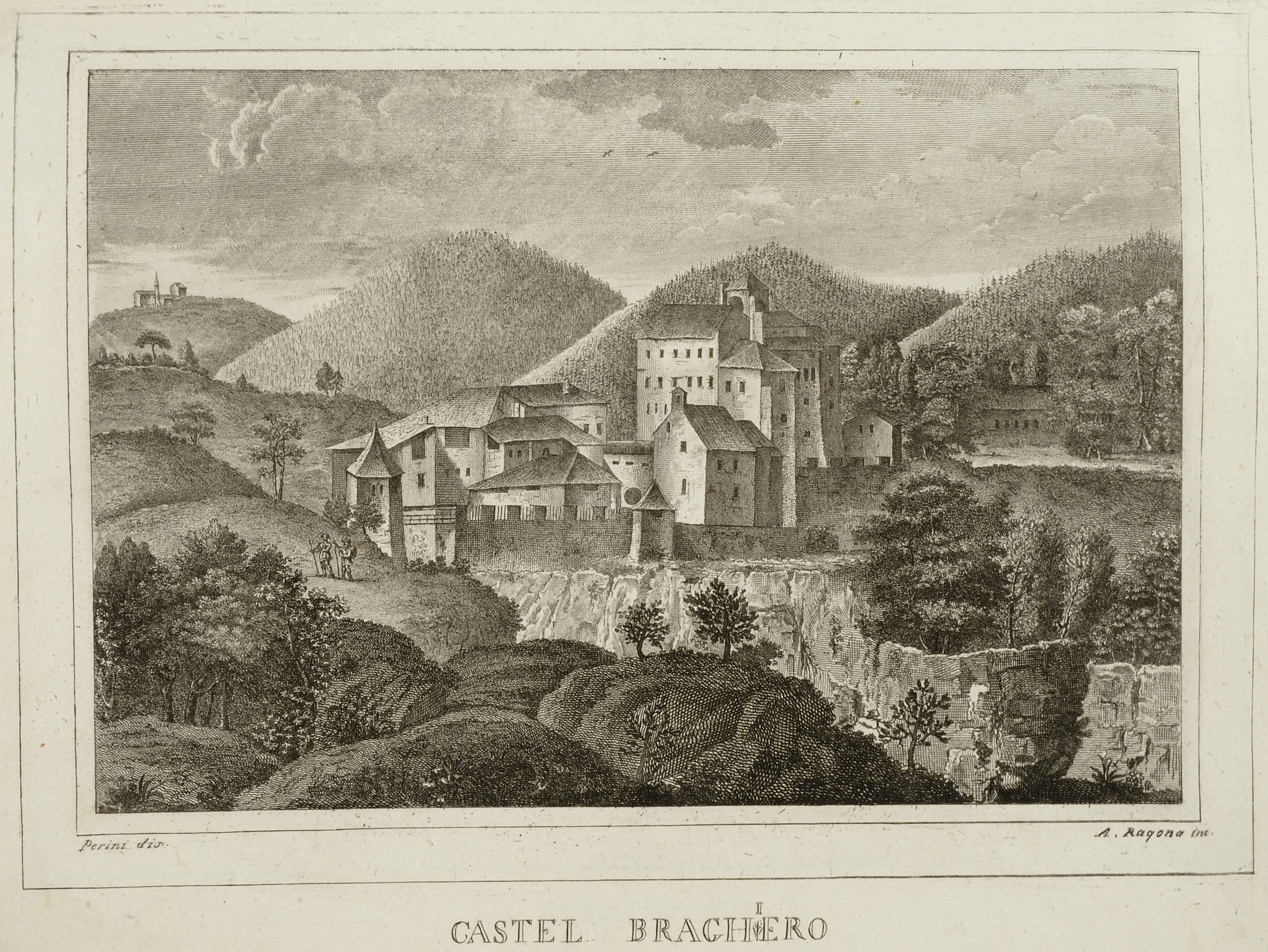Calcografia; 192x270 mm, 219x285 mm. Disegno di Agostino Perini, incisione di Antonio Ragona, pubblicata in Agostino Perini, I castelli del Tirolo colla storia delle relative antiche potenti famiglie, Milano, Pirrotta, a spese di Giuseppe Antonio Marietti, 1834-1839