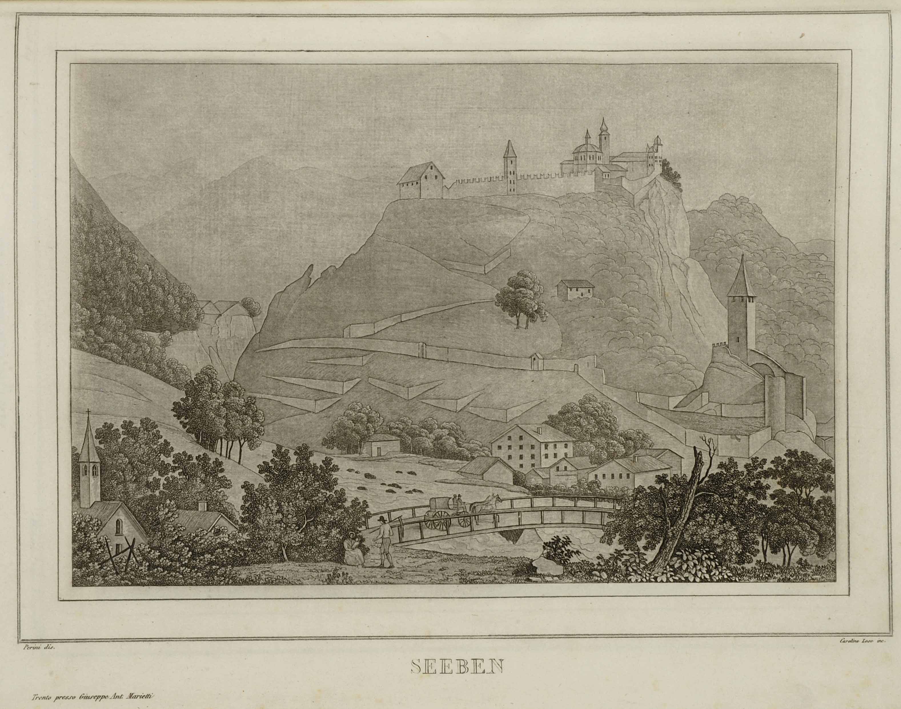 Calcografia; 190x266 mm, 222x310 mm. Disegno di Agostino Perini, incisione di Carolina Lose, pubblicata in Agostino Perini, I castelli del Tirolo colla storia delle relative antiche potenti famiglie, Milano, Pirrotta, a spese di Giuseppe Antonio Marietti, 1834-1839