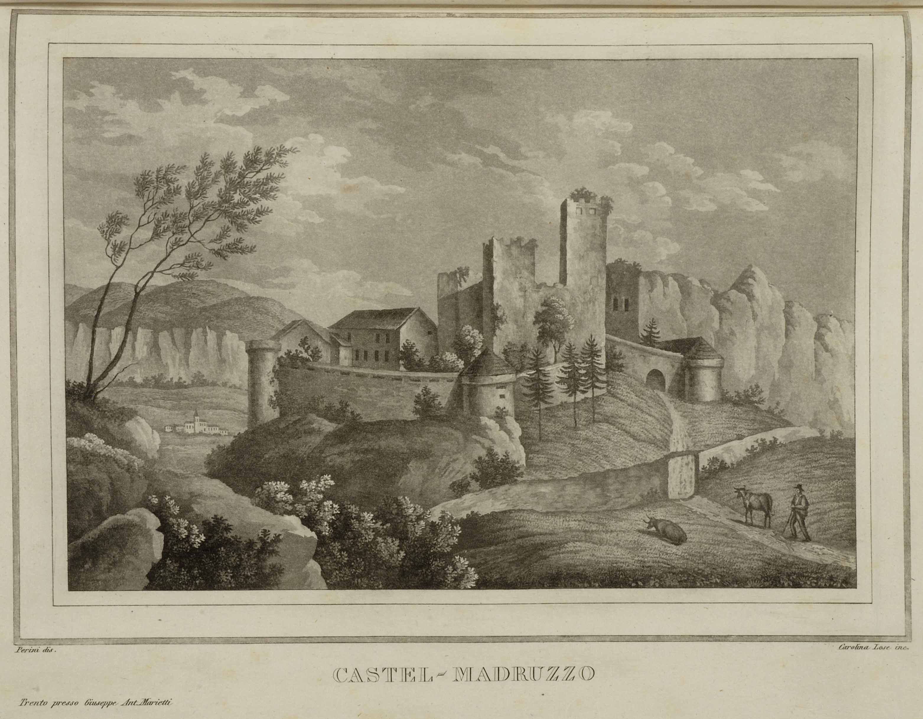 Calcografia; 189x265 mm, 221x304 mm. Disegno di Agostino Perini, incisione di Carolina Lose, pubblicata in Agostino Perini, I castelli del Tirolo colla storia delle relative antiche potenti famiglie, Milano, Pirrotta, a spese di Giuseppe Antonio Marietti, 1834-1839