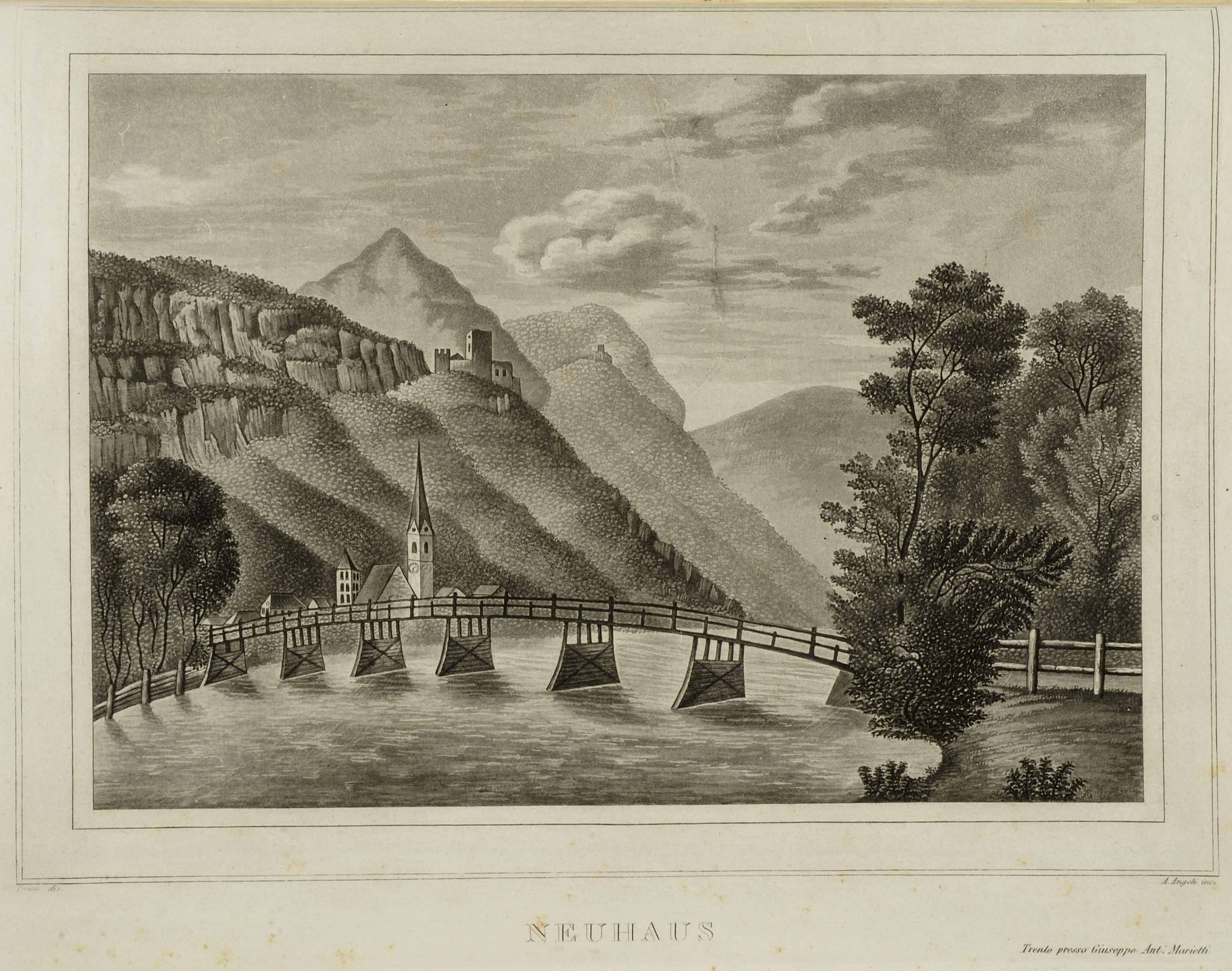 Calcografia; 207x266 mm, 222x289 mm. Disegno di Agostino Perini, incisione di Alessandro Angeli, pubblicata in Agostino Perini, I castelli del Tirolo colla storia delle relative antiche potenti famiglie, Milano, Pirrotta, a spese di Giuseppe Antonio Marietti, 1834-1839