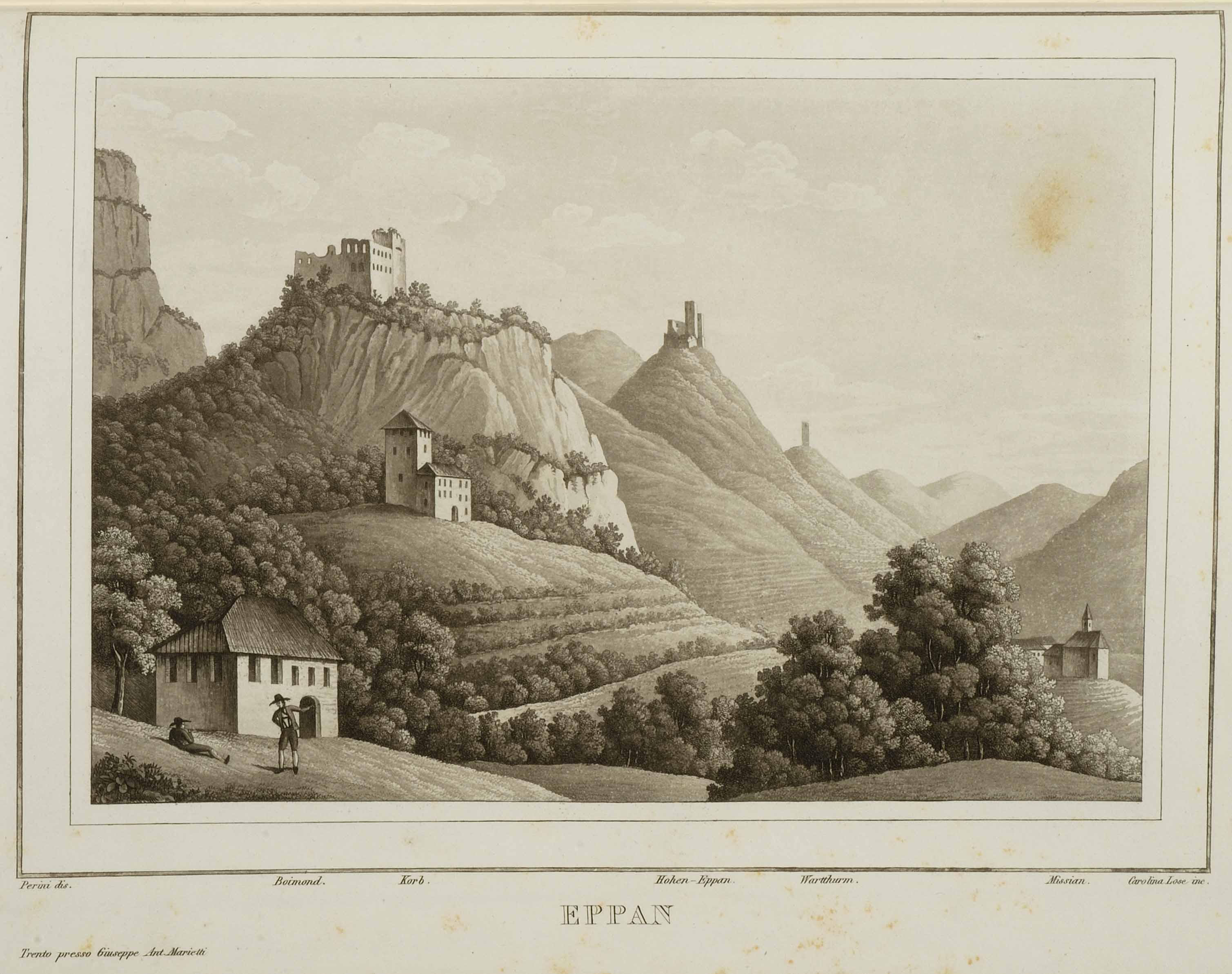 Calcografia; 189x261 mm, 220x299 mm. Disegno di Agostino Perini, incisione di Carolina Lose, pubblicata in Agostino Perini, I castelli del Tirolo colla storia delle relative antiche potenti famiglie, Milano, Pirrotta, a spese di Giuseppe Antonio Marietti, 1834-1839
