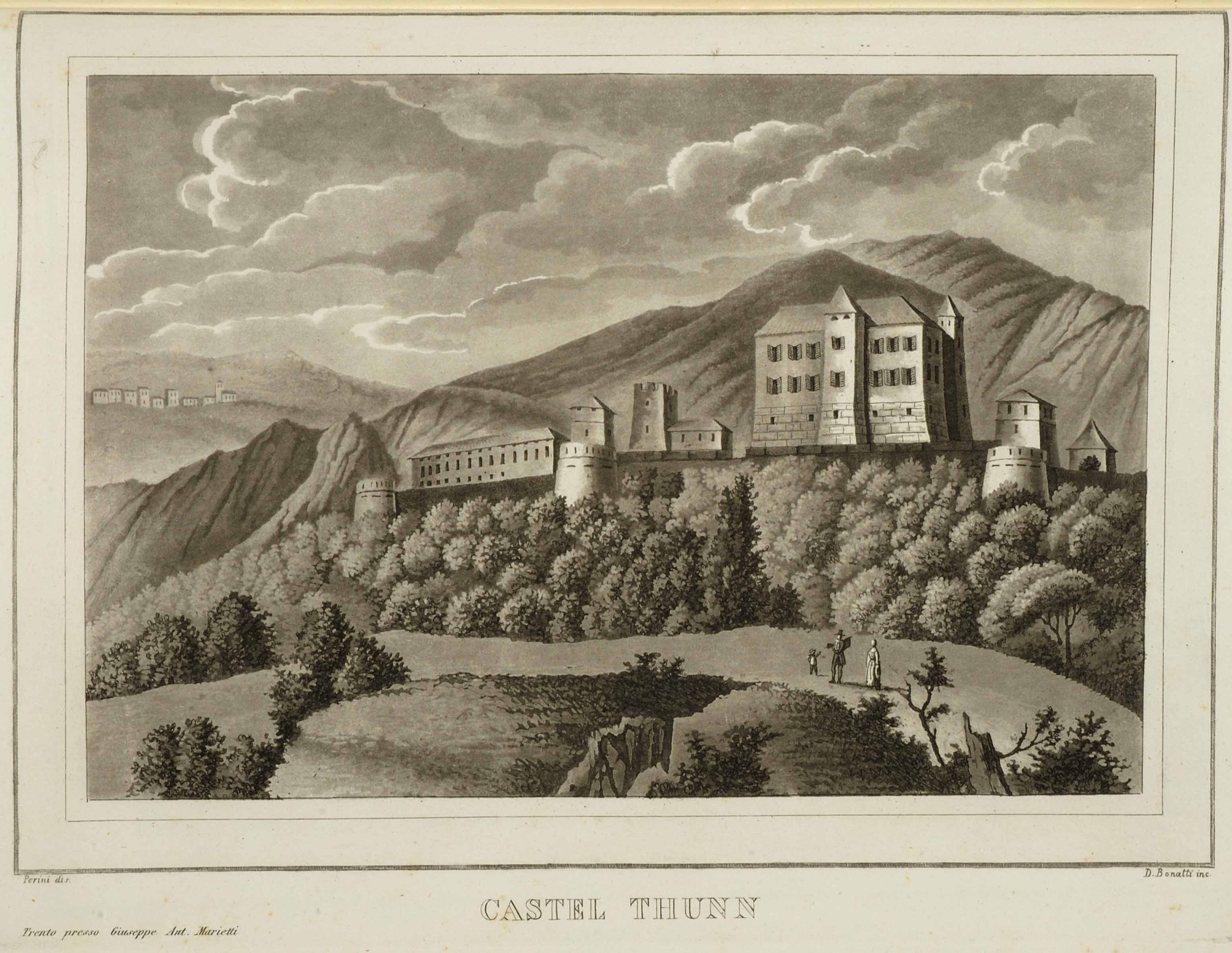 Calcografia; 186x260 mm, 208x279 mm. Disegno di Agostino Perini, incisione di Domenico Bonatti, pubblicata in Agostino Perini, I castelli del Tirolo colla storia delle relative antiche potenti famiglie, Milano, Pirrotta, a spese di Giuseppe Antonio Marietti, 1834-1839