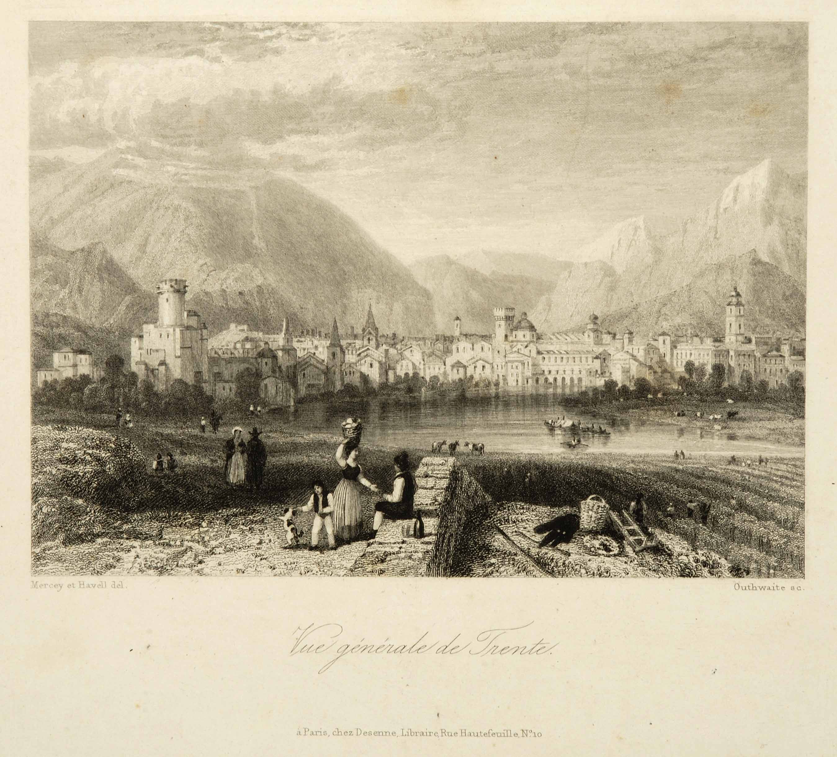 Calcografia; 105x147 mm, 275x177 mm. Disegno di Frédéric Mercey e Robert Havell, incisione di Jean Jacques Outhwaite, pubblicata in Frédéric Mercey, Histoire et description des principales villes de l'Europe. Tyrol. Trente, Paris, Desenne, 1835
