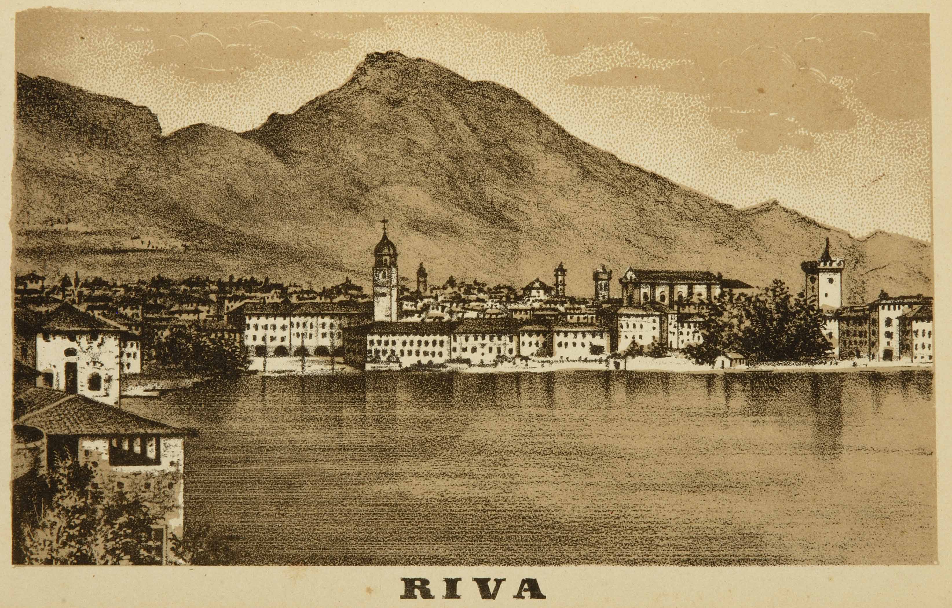 Litografia; 87x145 mm, su foglio 99x163 mm. Pubblicata in Emilio Vambianchi, Der Curort Arco in Süd-Tirol mit der Schwesterstadt Riva am Gardasee samt allen seinen nächsten Umgebungen und einer Notiz über Comano und seine Heilquellen ... Arco, Emmert, 1876