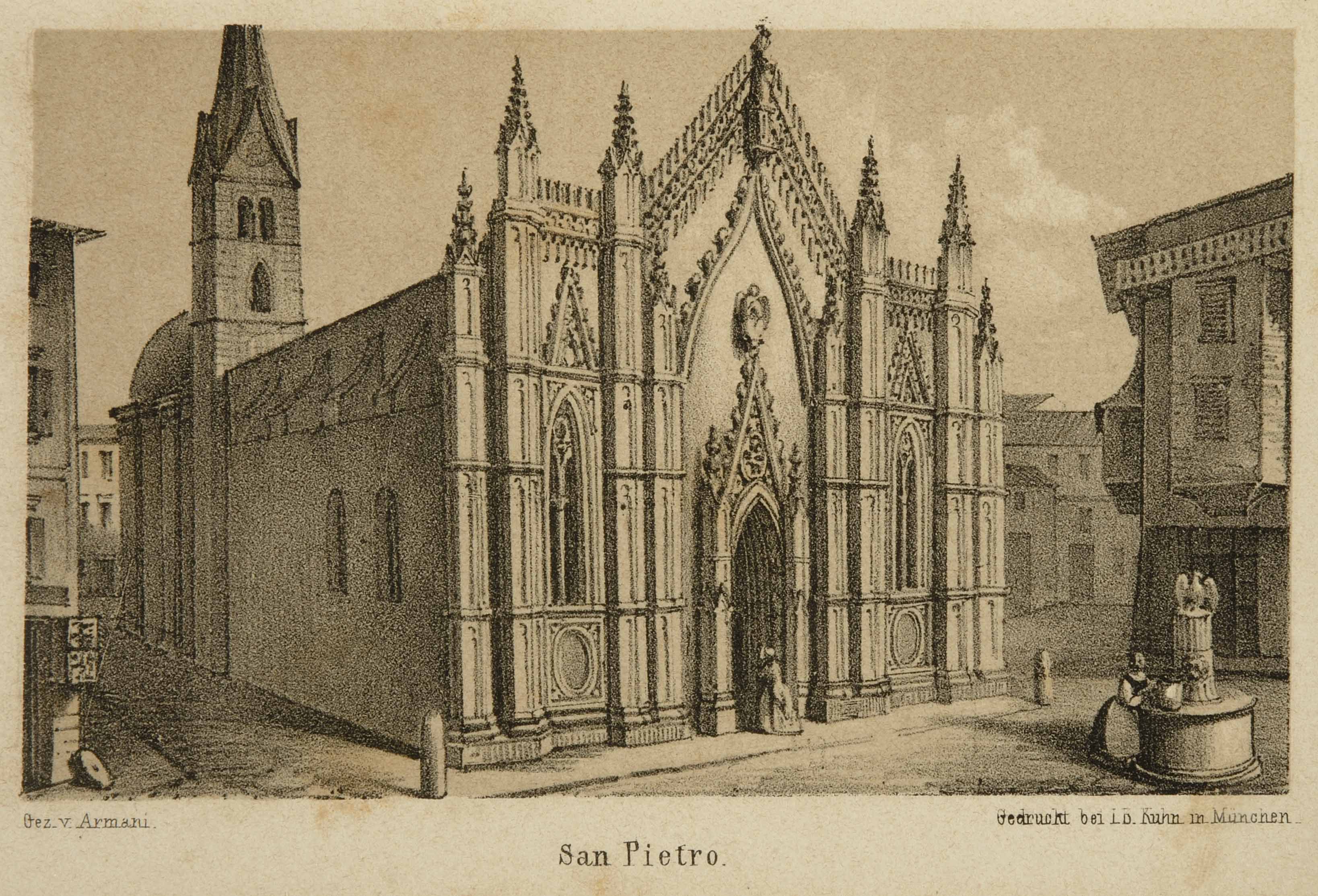 Litografia; 83x136 mm, su foglio 103x161 mm. Disegno di Basilio Armani, pubblicata nel 1859 e nel 1868 in Carlo Perini, Trento e i suoi contorni. Guida del viaggiatore, Trento, Seiser