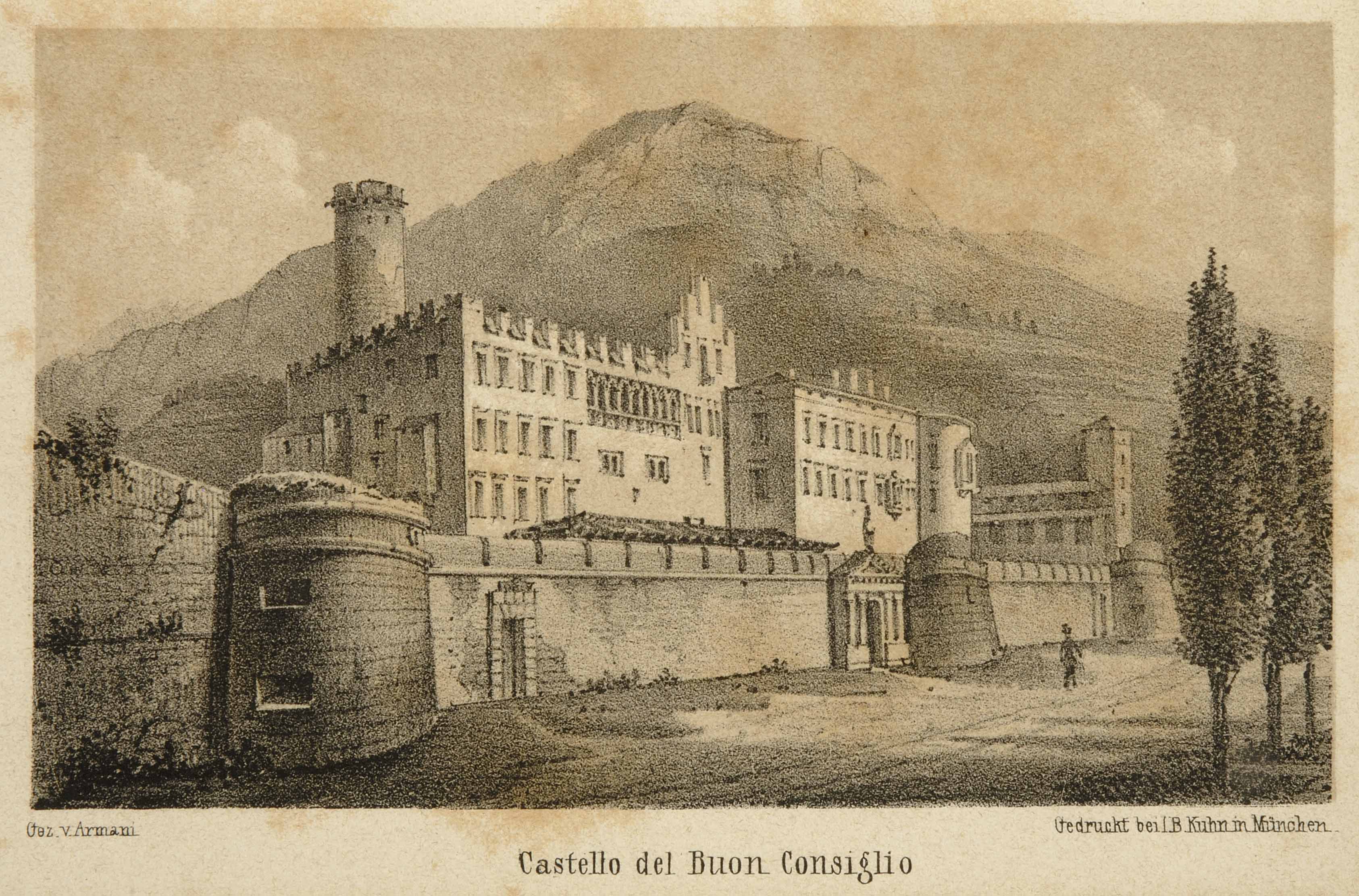 Litografia; 83x138 mm, 103x161 mm. Disegno di Basilio Armani, pubblicata nel 1859 e nel 1868 in Carlo Perini, Trento e i suoi contorni. Guida del viaggiatore, Trento, Seiser