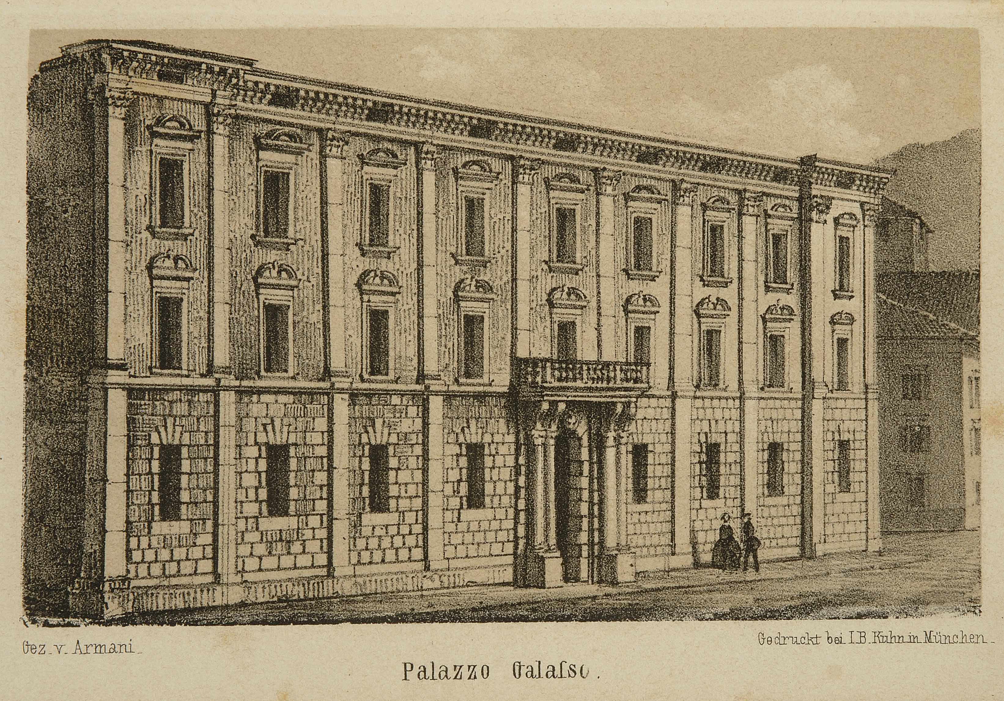 Litografia; 84x136 mm, su foglio 103x161 mm. Disegno di Basilio Armani, pubblicata nel 1859 e nel 1868 in Carlo Perini, Trento e i suoi contorni. Guida del viaggiatore, Trento, Seiser