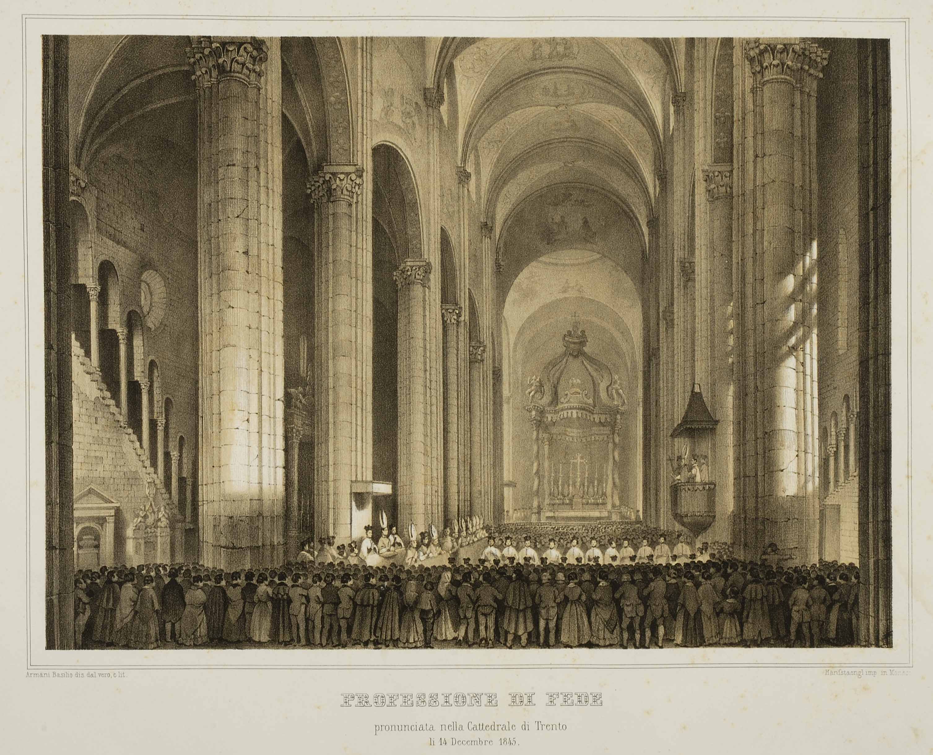 Litografia; 229x312 mm, su foglio 338x458 mm. Pubblicata in Feste secolari del Concilio di Trento con solenne rito celebrate nei giorni 12, 13 e 14 dicembre 1845 descritte, ed illustrate, Trento, Comune di Trento, Istituto sociale, 1845