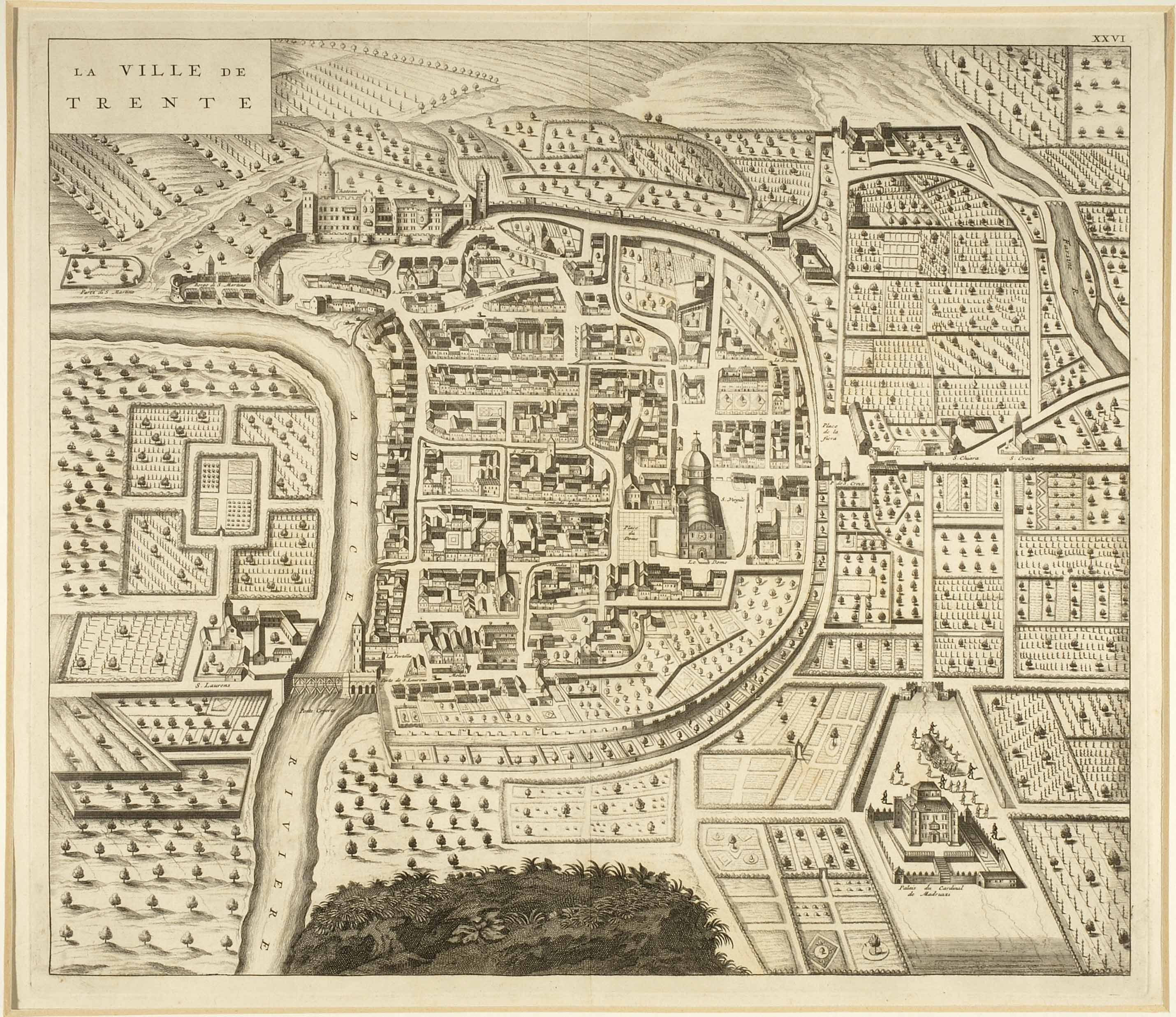 Calcografia; 397x460 mm, 413x476 mm. Incisione attribuita a Joan Blaeu, pubblicata tra il 1704 e il 1724 ad Amsterdam da Pieter Mortier (1704 e 1705) e a Den Haag da Christoffel Rutgert Alberts nel 1724 (cfr. Franco Cappelletti, Imago Tridenti. Incisioni e libri illustrati dal XV al XVIII secolo, Trento, Biblioteca comunale di Trento, 1996, pp. 201-210)