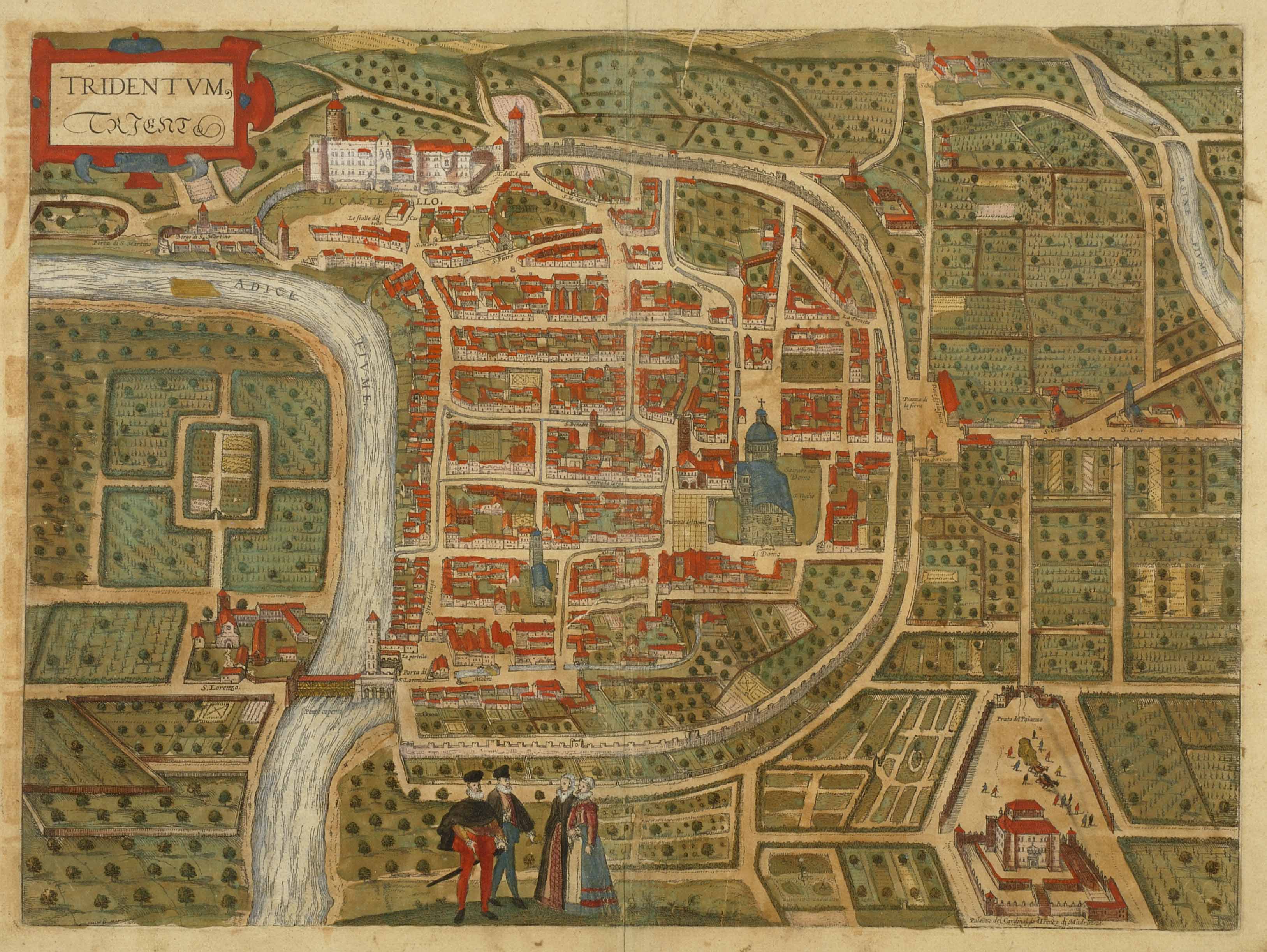 Calcografia; 345x465 mm, 346x465 mm. Incisione attribuita a Franz Hogenberg, pubblicata a Köln da Gottfried von Kempen (1581, 1582, 1588), Johann Sinniger (1583), Bertram Buchholtz (1599), Peter von Brachel (1606, 1612, 1616, 1621) (Cfr. Franco Cappelletti, Imago Tridenti. Incisioni e libri illustrati dal XV al XVIII secolo, Trento, Biblioteca comunale di Trento, 1996, pp. 51-58)