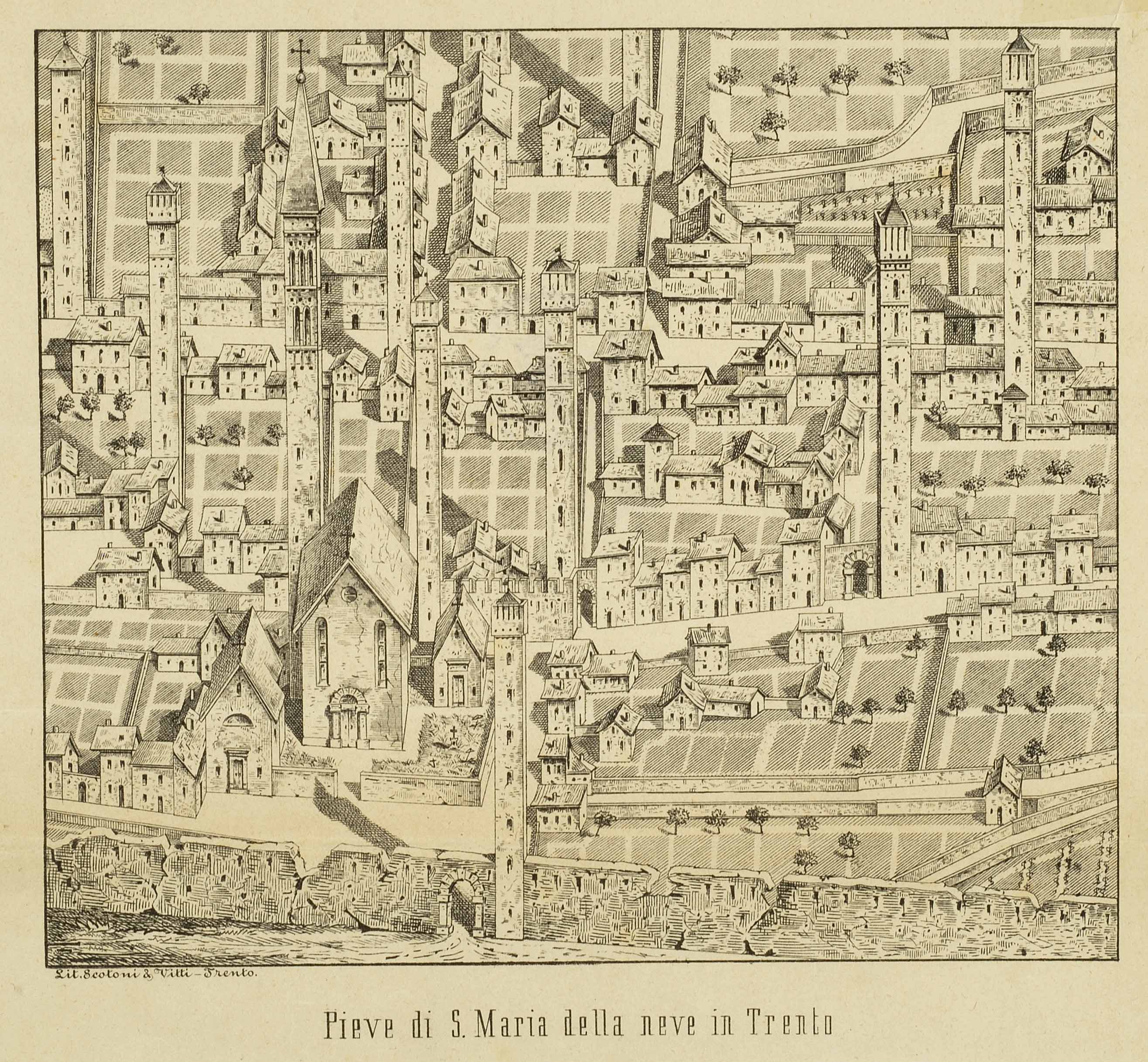 Litografia; 177x204 mm, su foglio 249x276 mm. Pubblicata in Giovanni Battista Zanella, S. Maria di Trento, cenni storici, Trento, Monauni, 1879