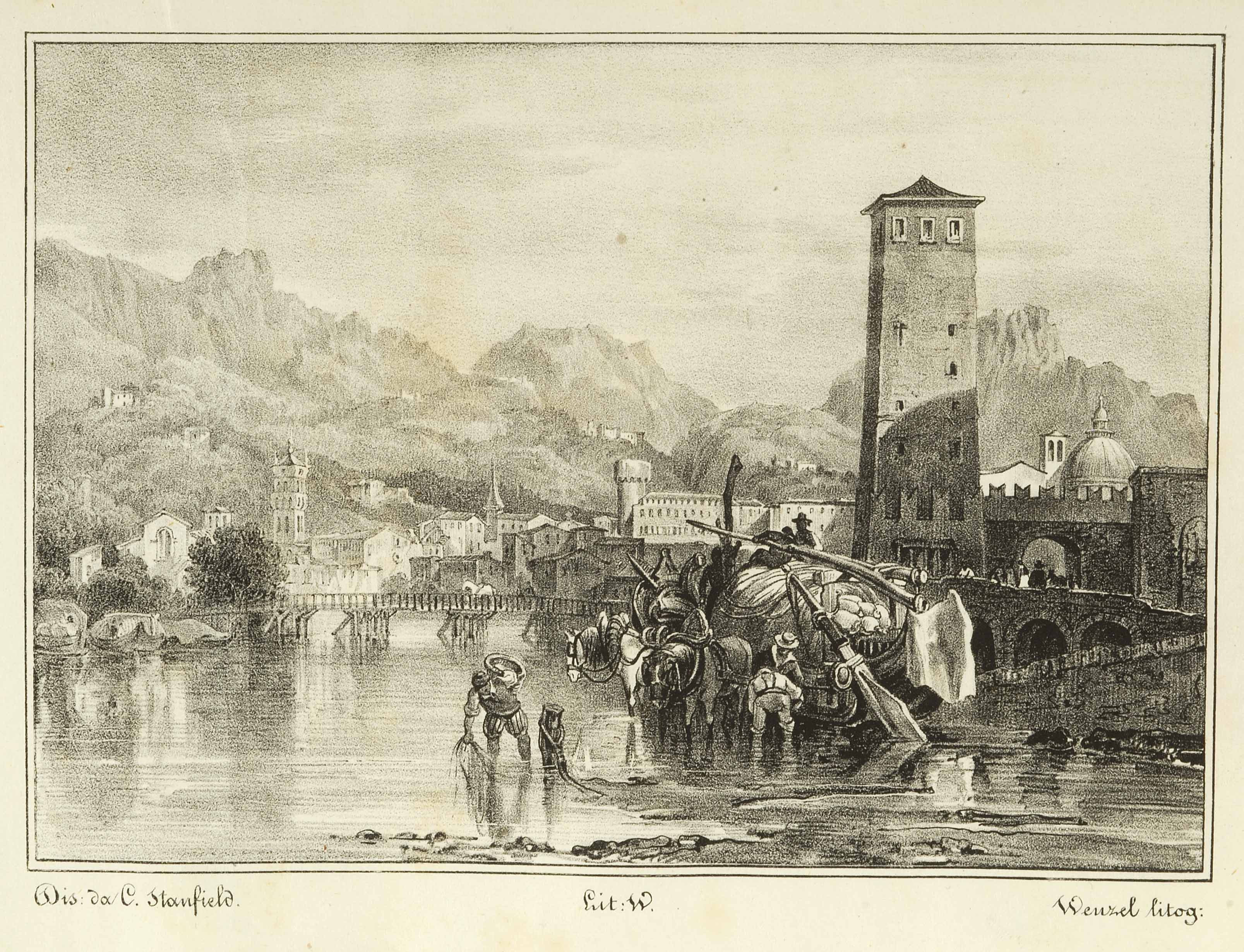 Litografia; 103x153 mm, su foglio 135x219 mm. Titolo formulato dal catalogatore, disegno di Clarkson William Stanfield, litografia di Franz Wenzel, pubblicata in La cesta di fiori, keepsake per le dame, Napoli, Tipografia dell’ancora, [1840]