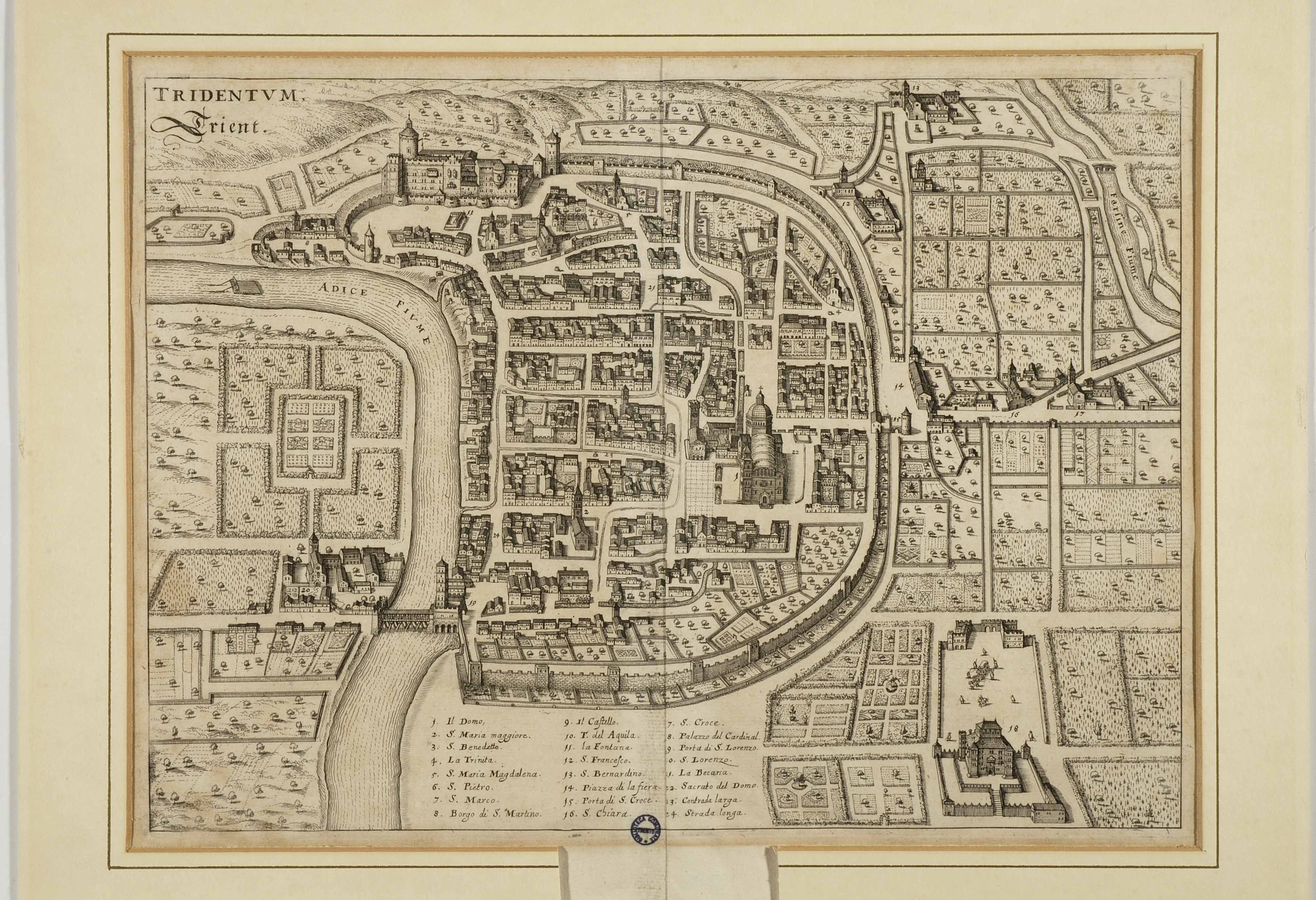 Calcografia, 250x346 mm, 257x355 mm. Incisione attribuita a Matthäus Merian, pubblicata a Frankfurt am Main da Matthäus Merian (1640 e 1649), dagli eredi Merian (1656, 1716), da Johann Arnold Cholinus (1679) e in un'edizione senza note tipografiche nel 1736. (Cfr. Franco Cappelletti, Imago Tridenti. Incisioni e libri illustrati dal XV al XVIII secolo, Trento, Biblioteca comunale di Trento, 1996, pp. 105-110)