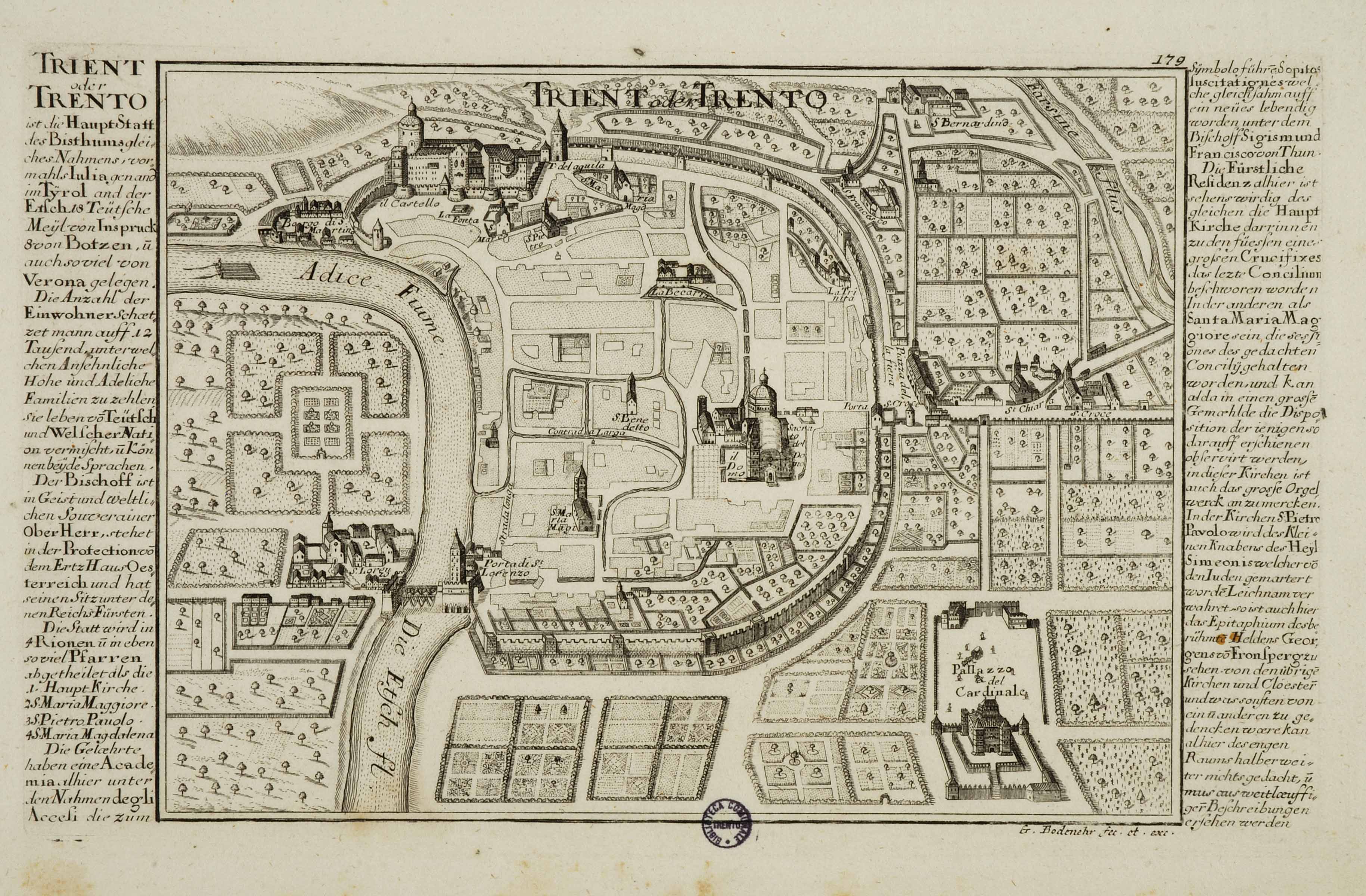 Calcografia; 155x209 mm, 159x263 mm. Incisione di Johann Stridbeck, data di pubblicazione e note tipografiche da Franco Cappelletti, Imago Tridenti. Incisioni e libri illustrati dal XV al XVIII secolo, Trento, Biblioteca comunale di Trento, 1996, pp. 229-230